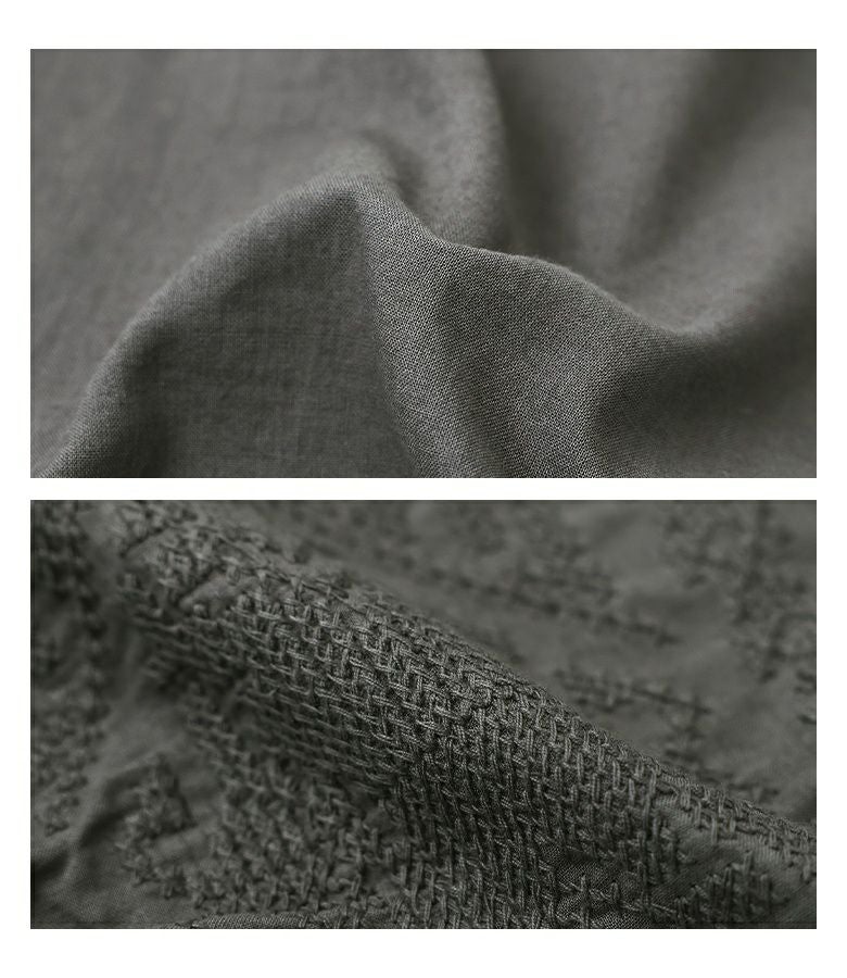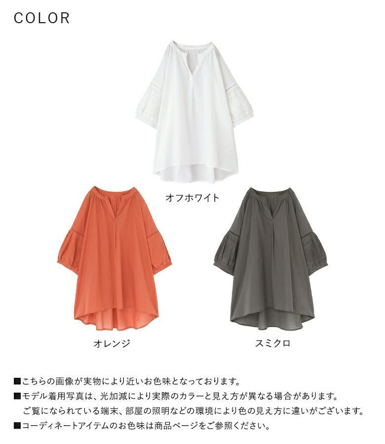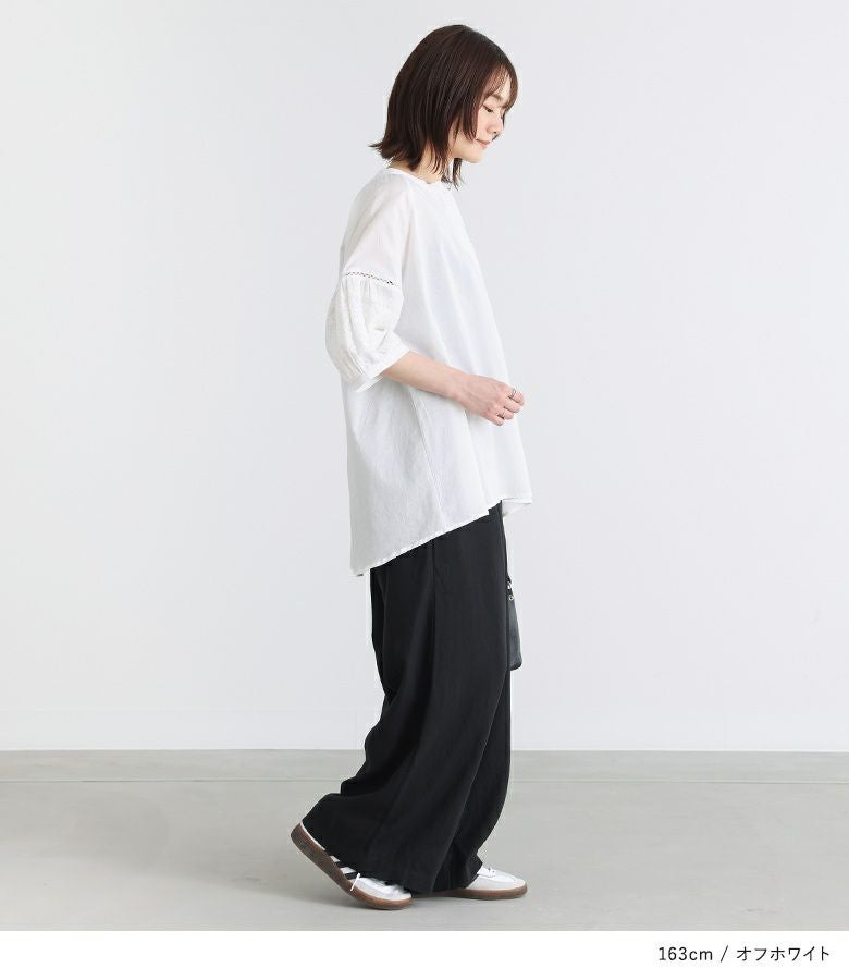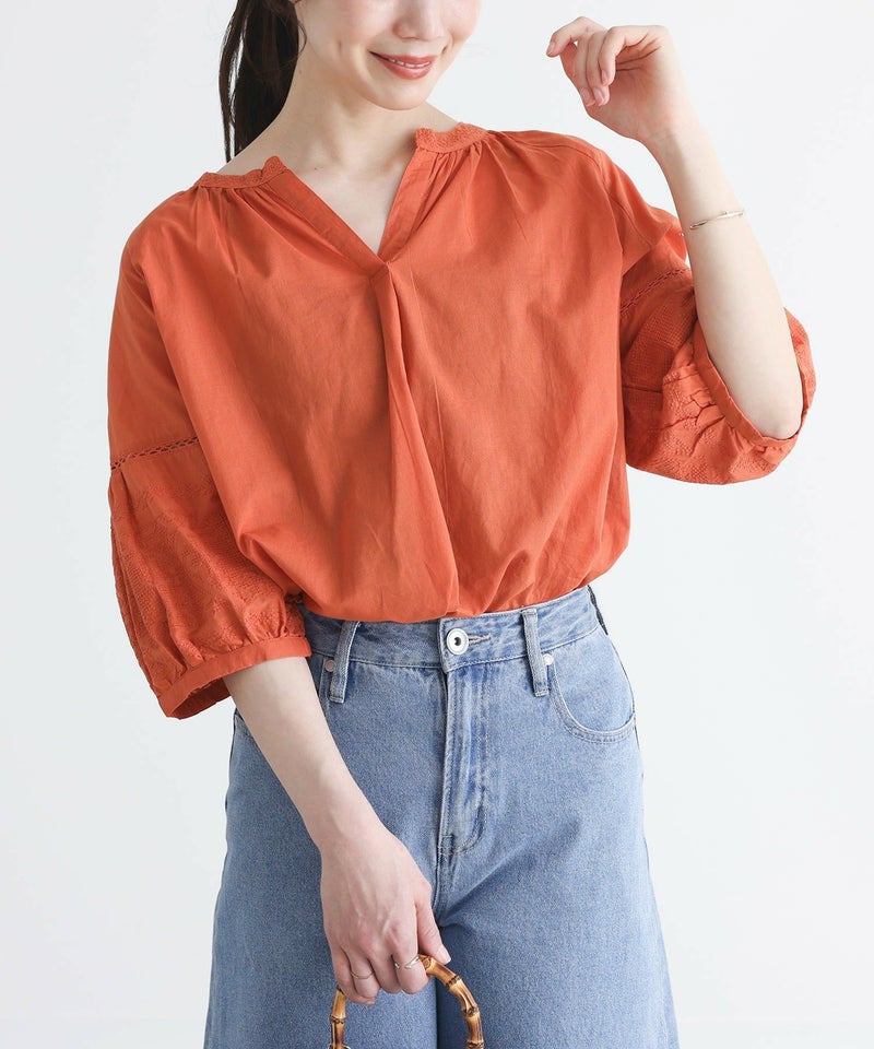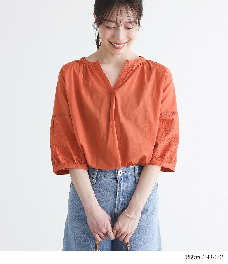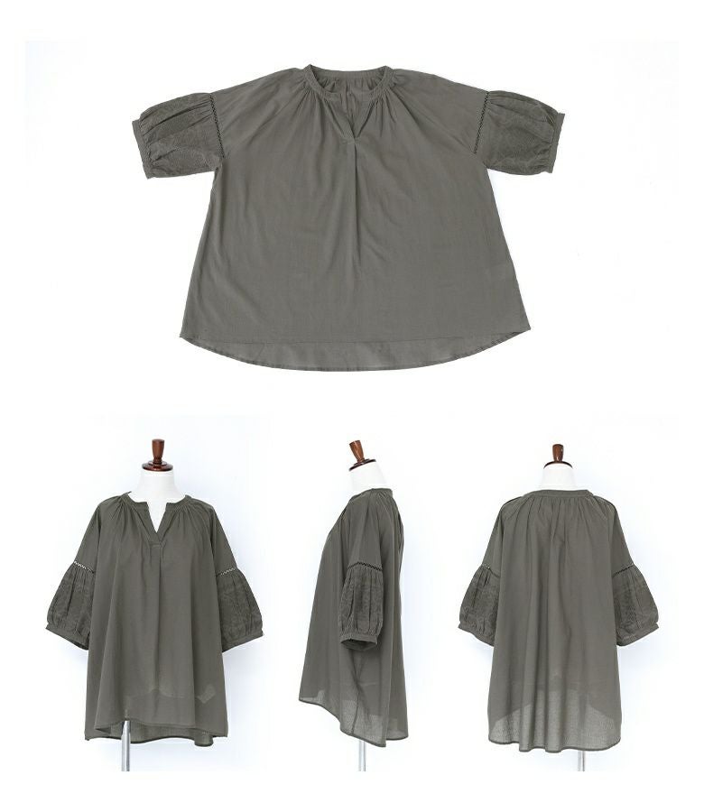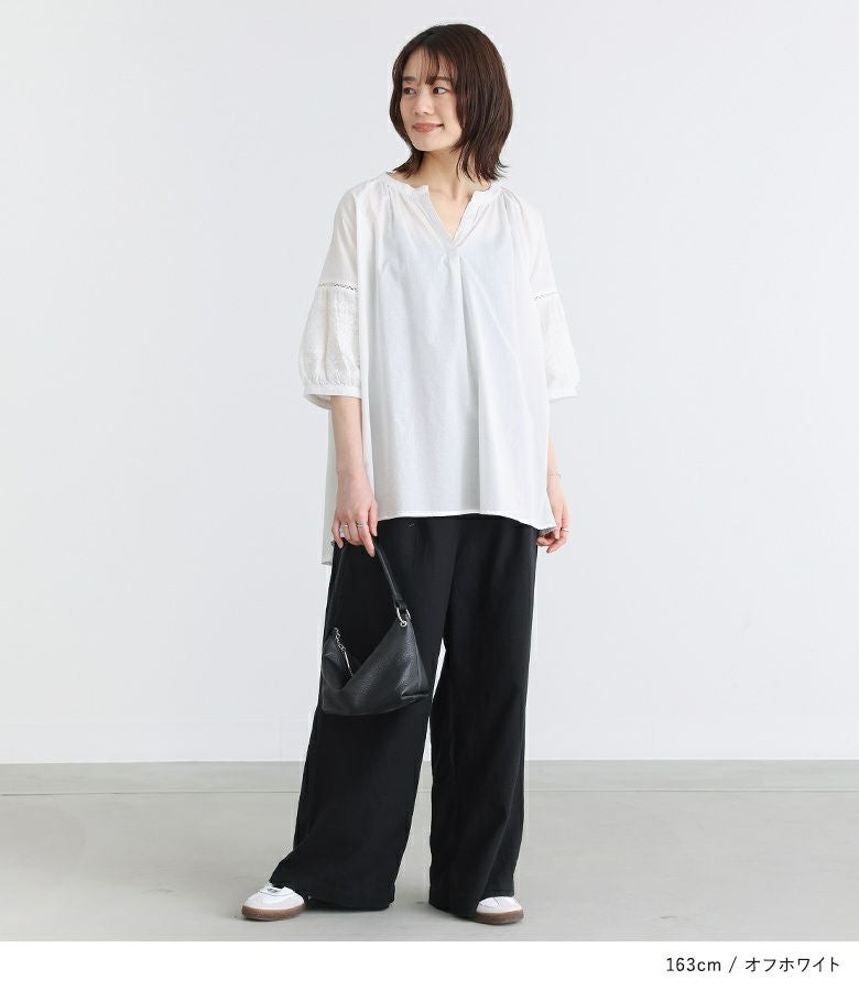 襟ぐりと袖に施した、同色のクロスステッチ刺繍がポイントになったスキッパーブラウス。インド製品ならではの、手の込んだ刺繍デザインをお楽しみください。袖の切り替え部分にはレーステープを使い、透け感が涼し気な印象に。キーネックが抜け感をプラスします。襟ぐり下には程良くギャザーを入れて張り付かず快適に着用できます。