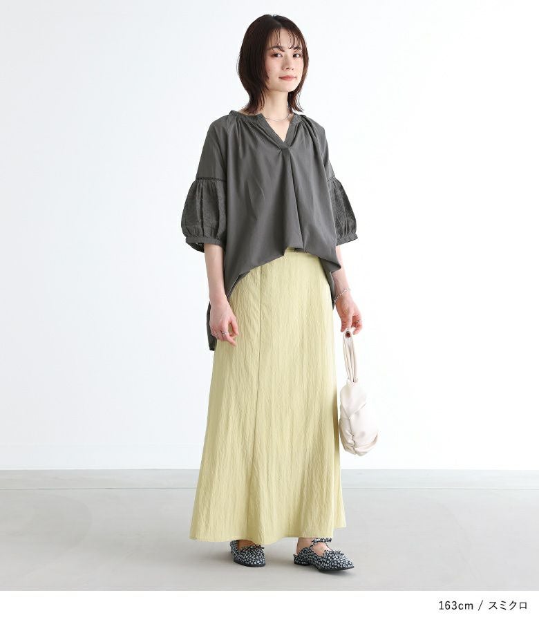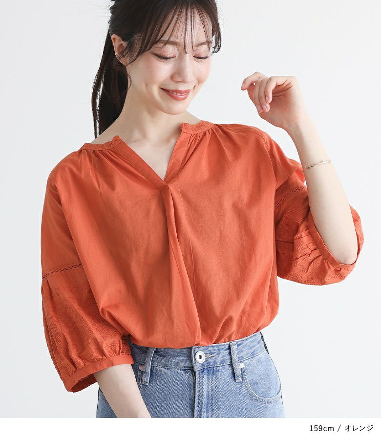同色のクロスステッチ刺繍がポイントのスキッパーブラウス。