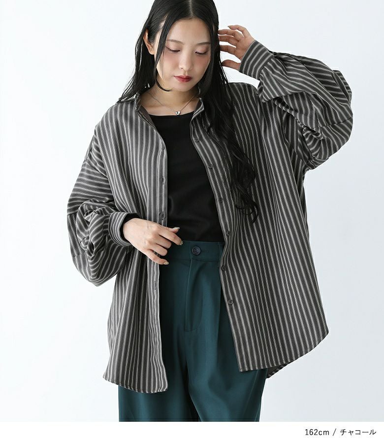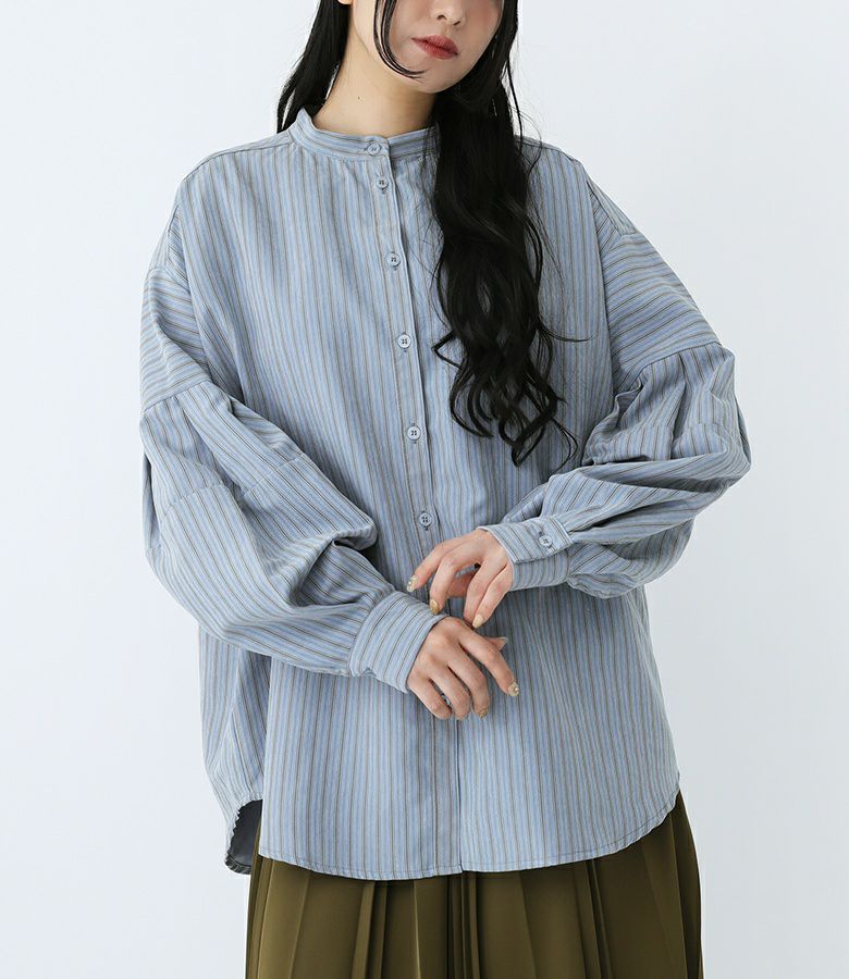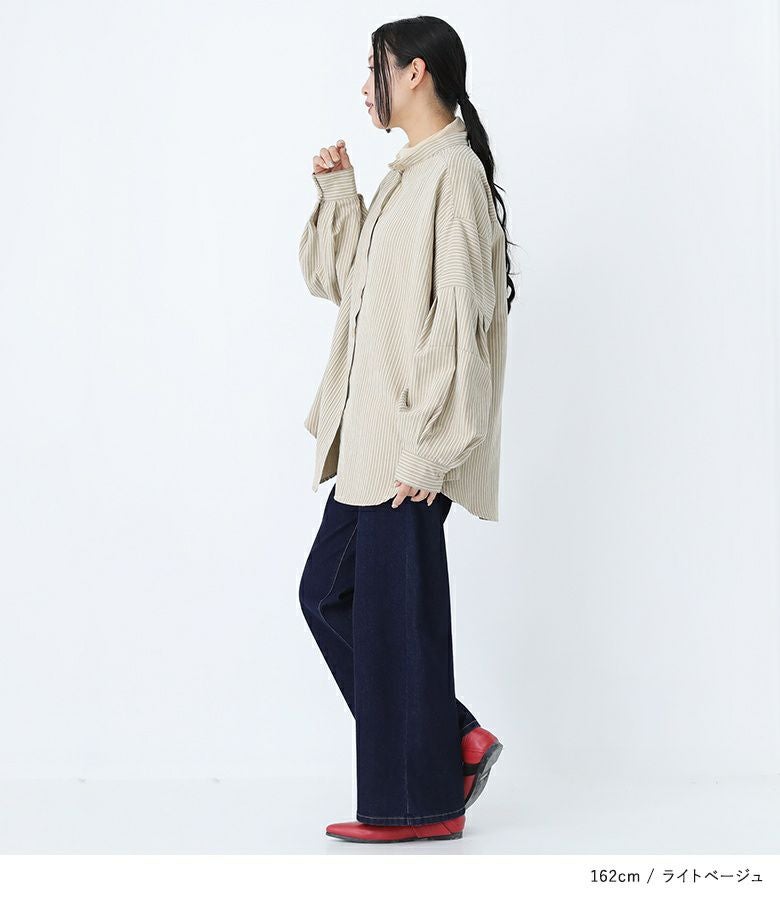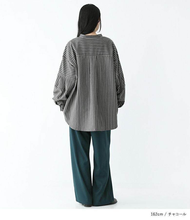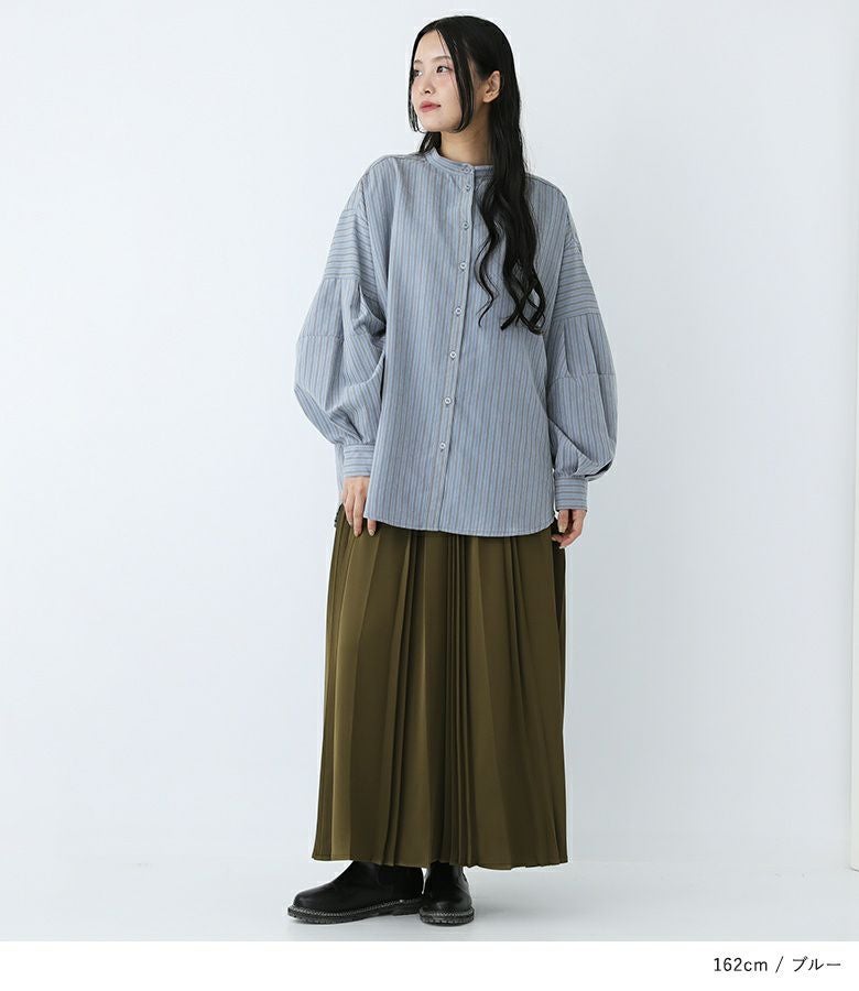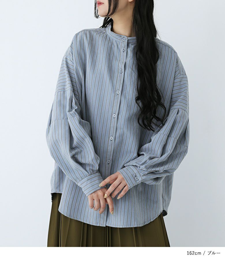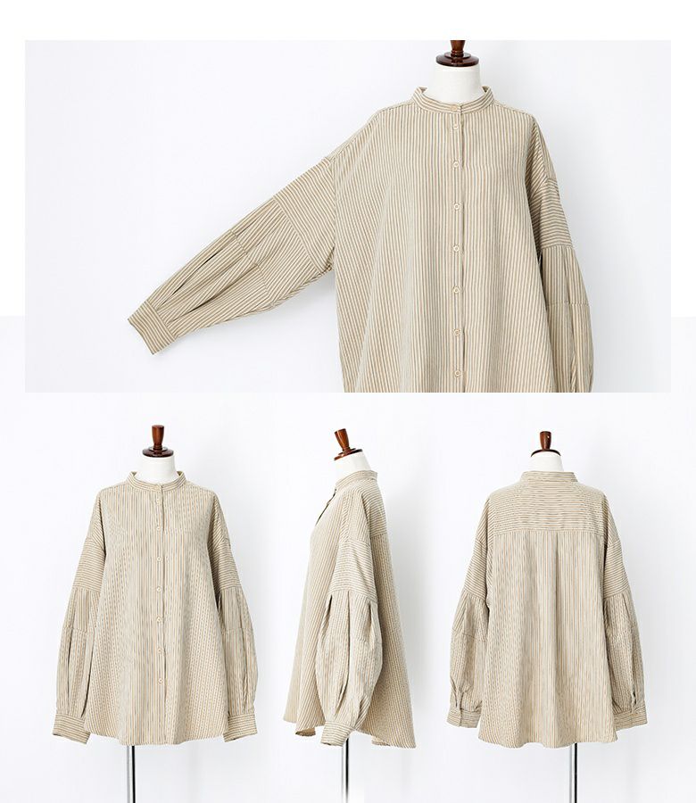 ボリューム袖が着映える、ストライプ柄生地のブラウス。