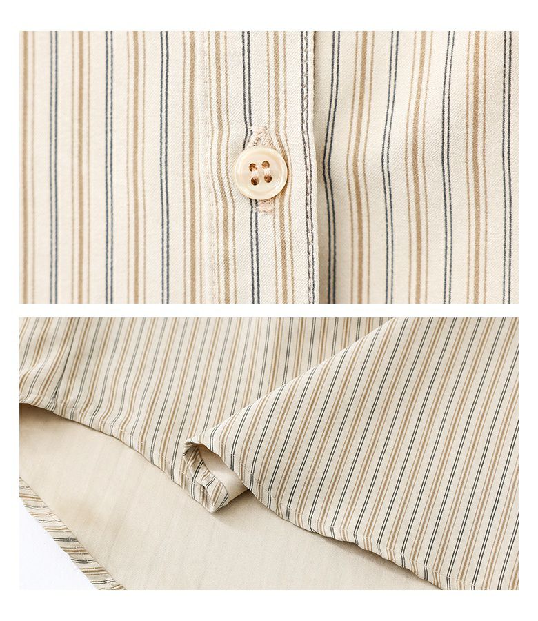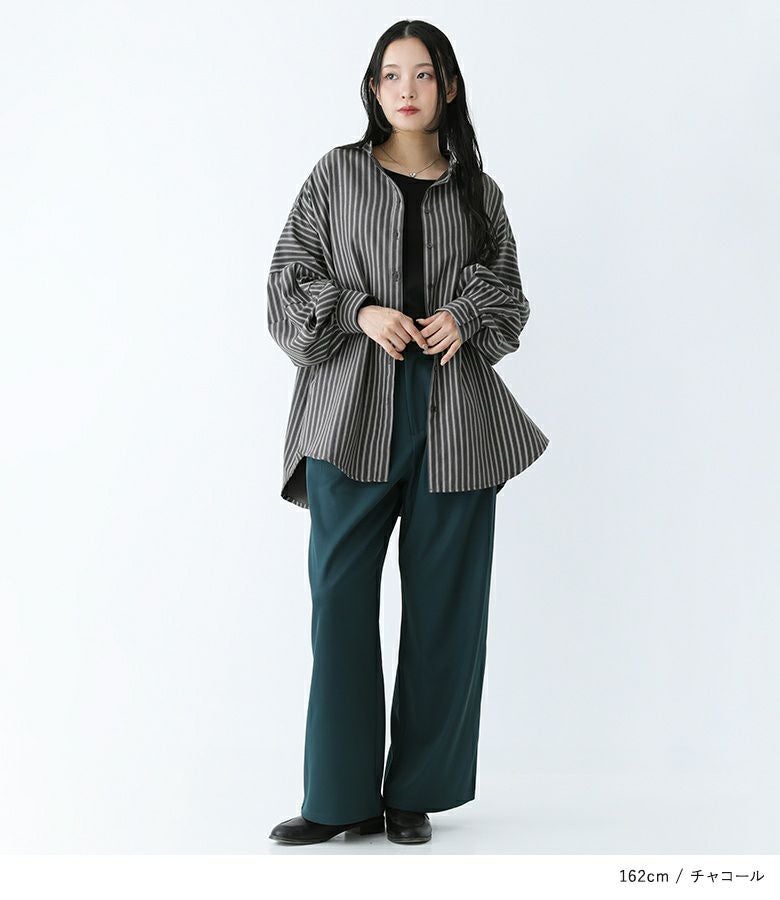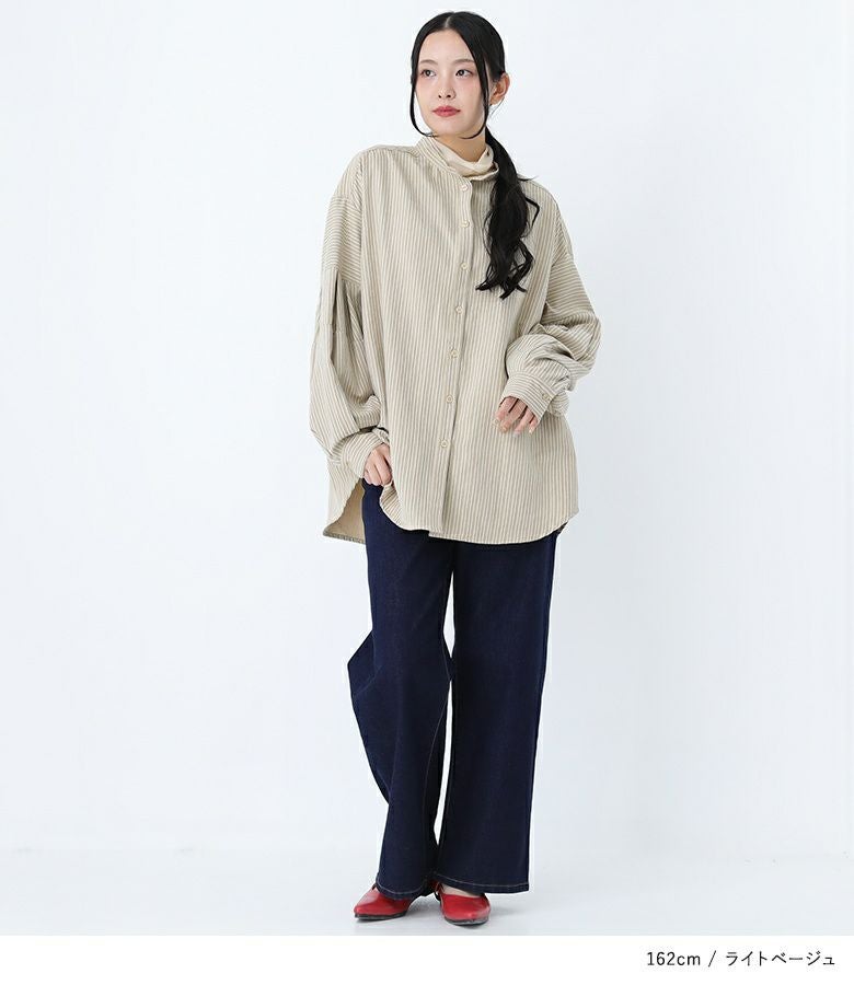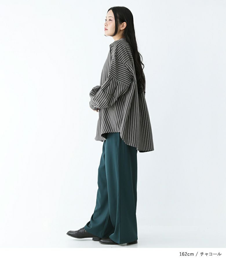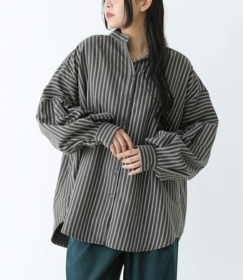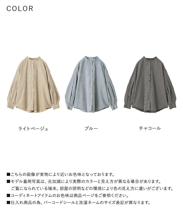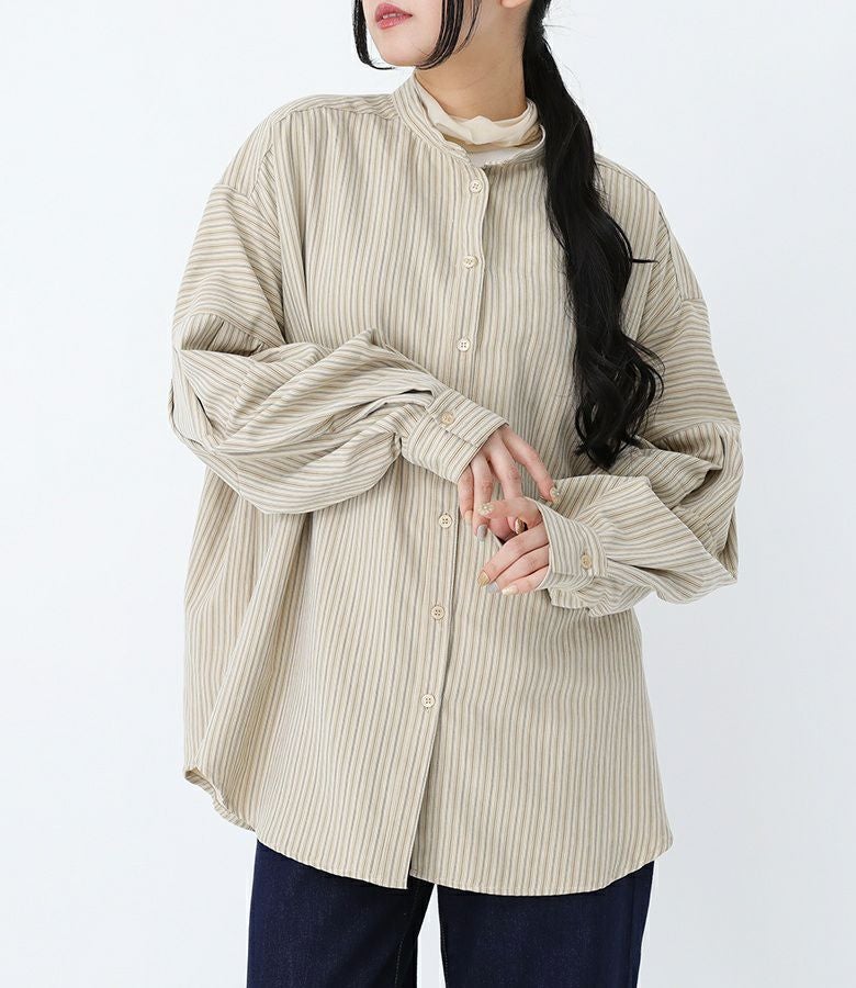 ボリューム袖が着映える、ストライプ柄生地のブラウス。