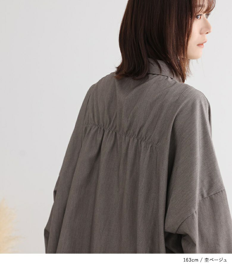 バックシャーリングがポイントになったデザインシャツ。スマートな印象のブラウスに、後ろのシャーリングデザインでシルエットに遊び心をプラスしました。