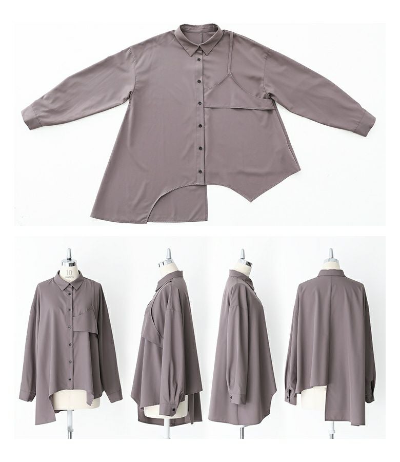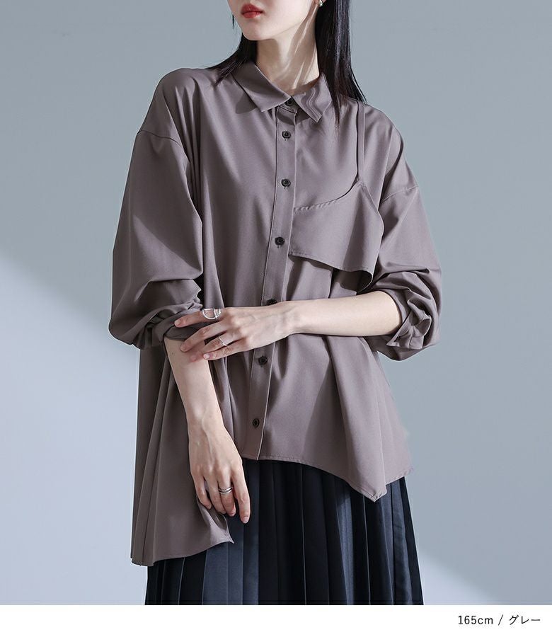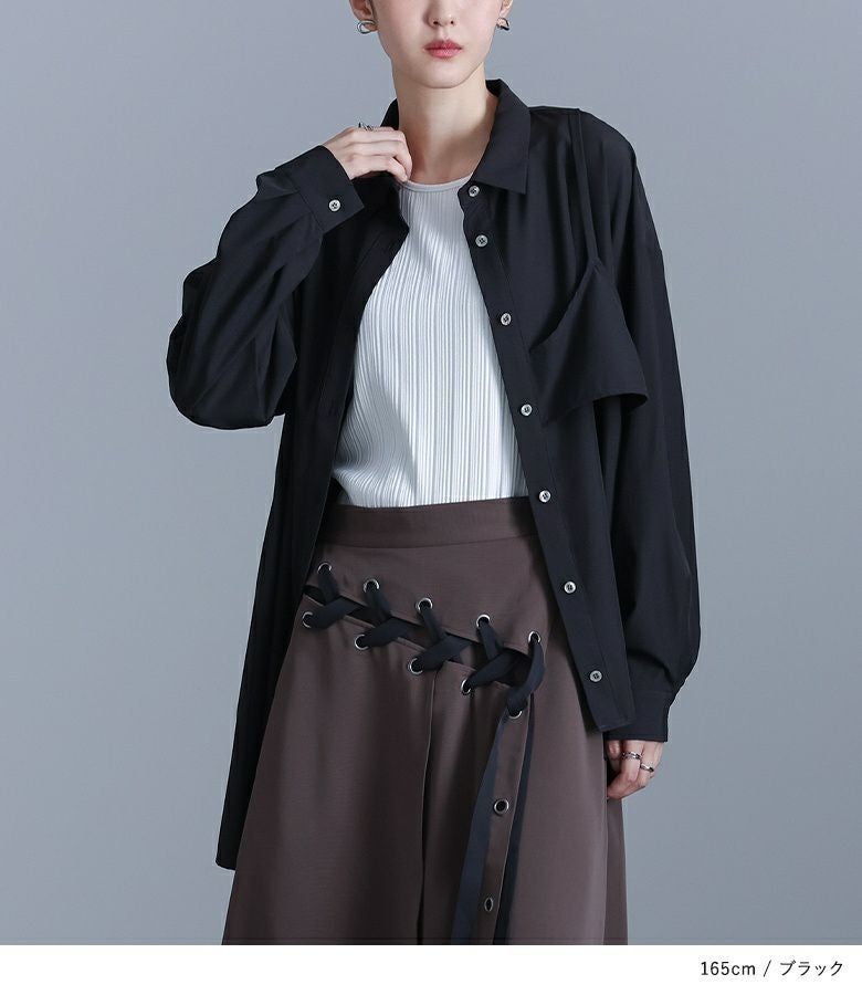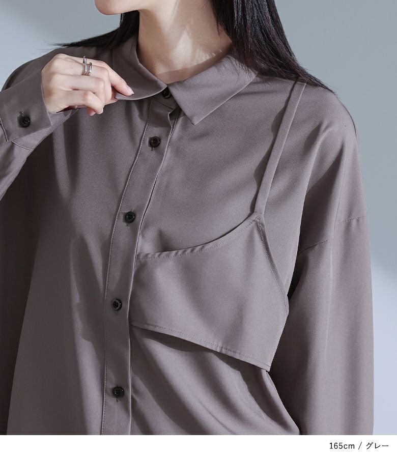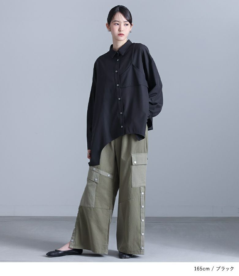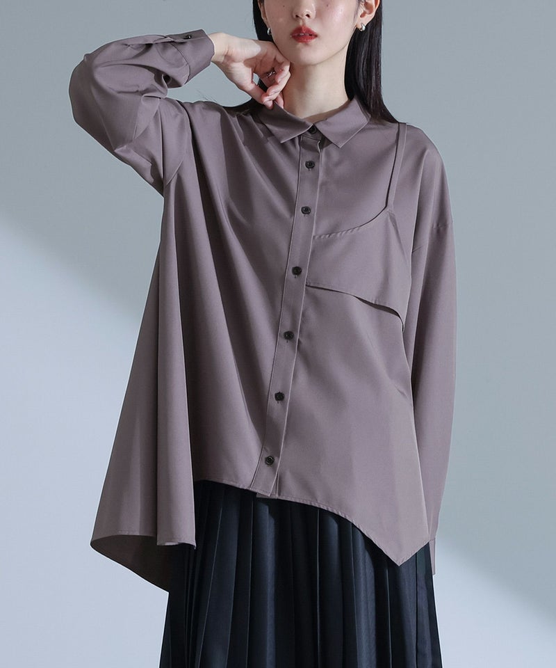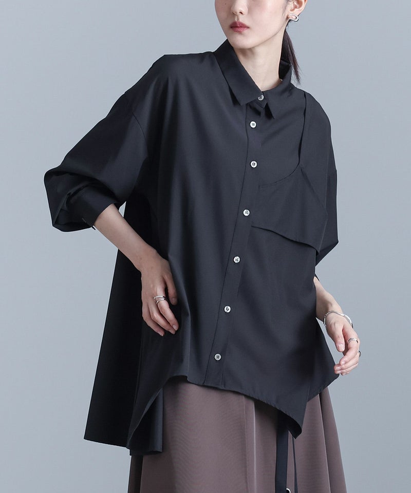左身頃にのみキャミソールをドッキングすることで個性的な雰囲気を作り出すデザインシャツ。袖口のタックと裾のたっぷりフレアで、立体感のあるデザインに仕立て上げています。裾がアシンメトリーになっているのもポイント。ボタンは貝調デザインで、程よい光沢感が綺麗めな印象を引き立てます。