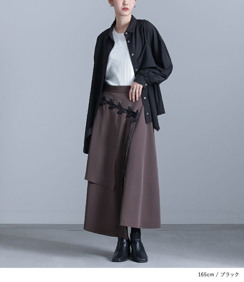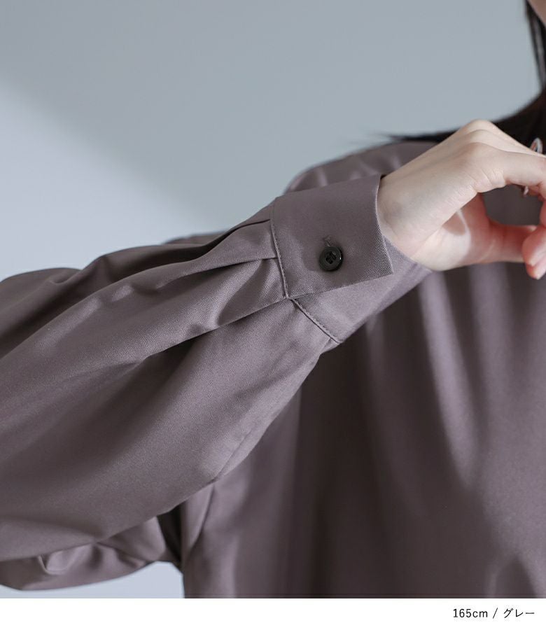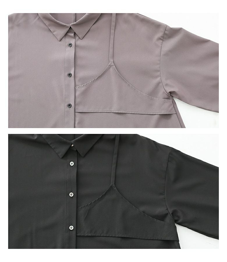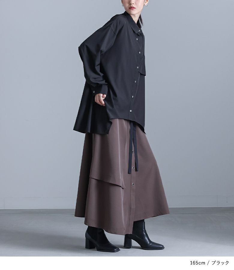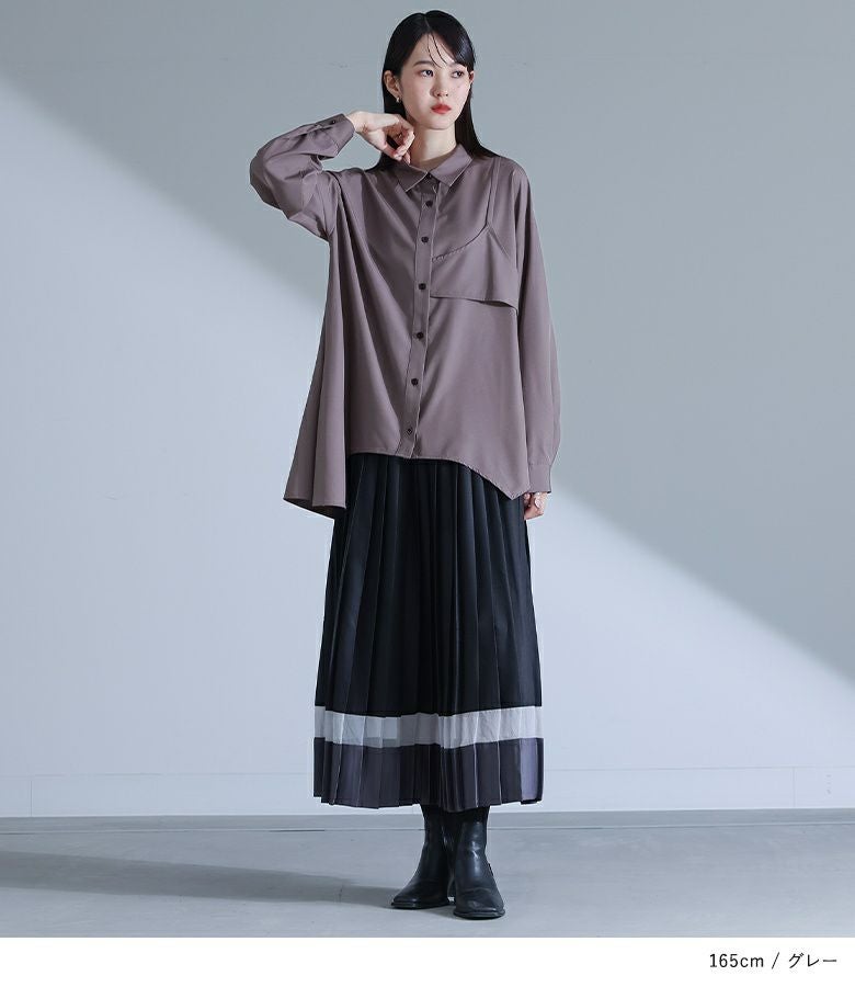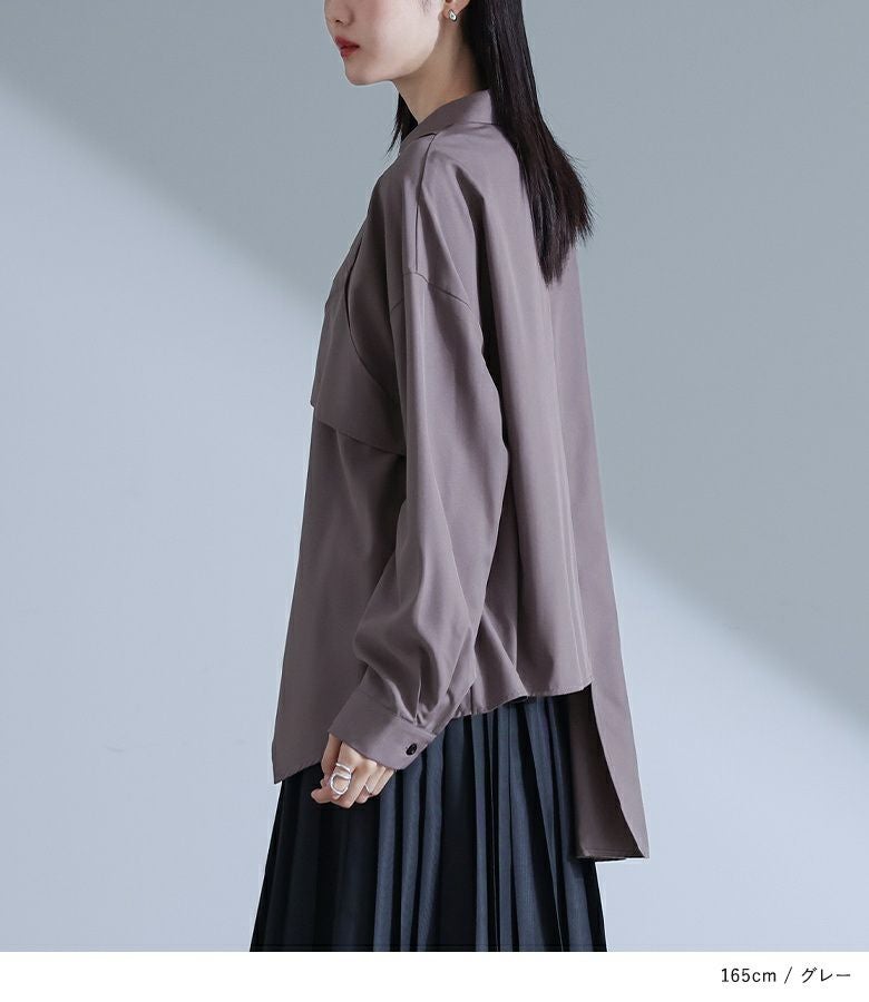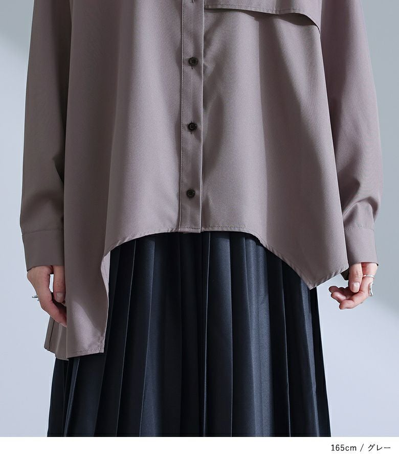 左身頃にのみキャミソールをドッキングすることで個性的な雰囲気を作り出すデザインシャツ。袖口のタックと裾のたっぷりフレアで、立体感のあるデザインに仕立て上げています。裾がアシンメトリーになっているのもポイント。ボタンは貝調デザインで、程よい光沢感が綺麗めな印象を引き立てます。
