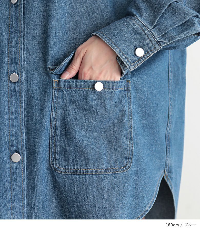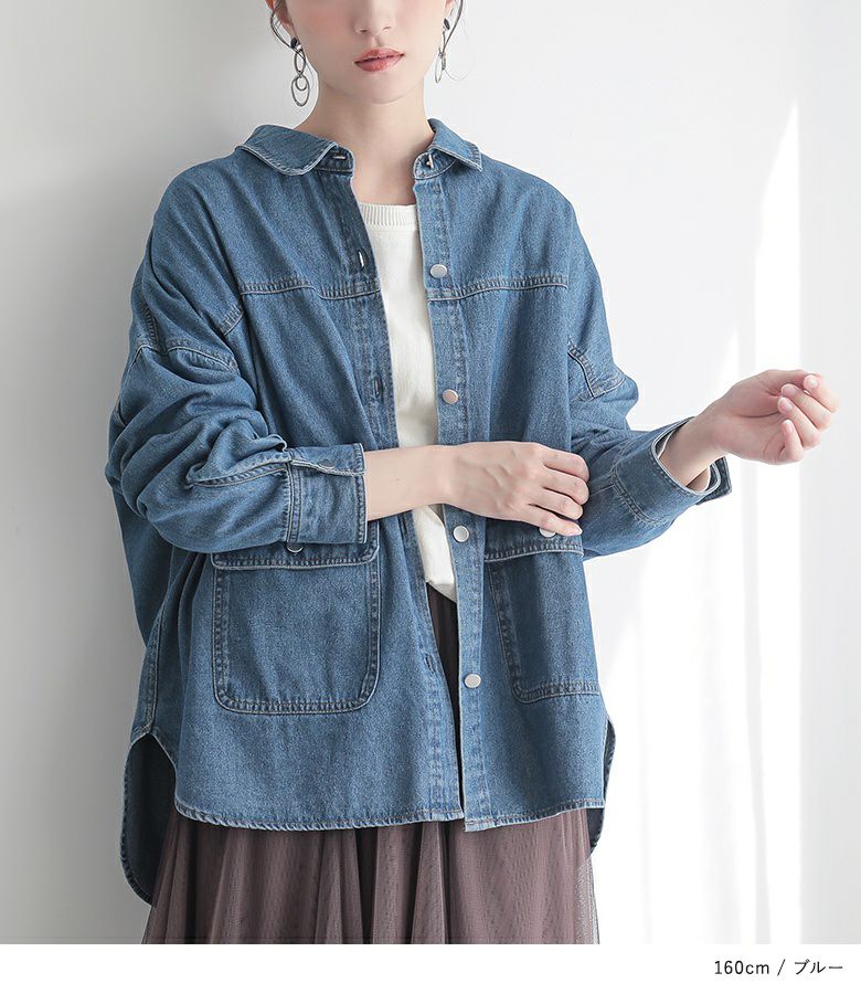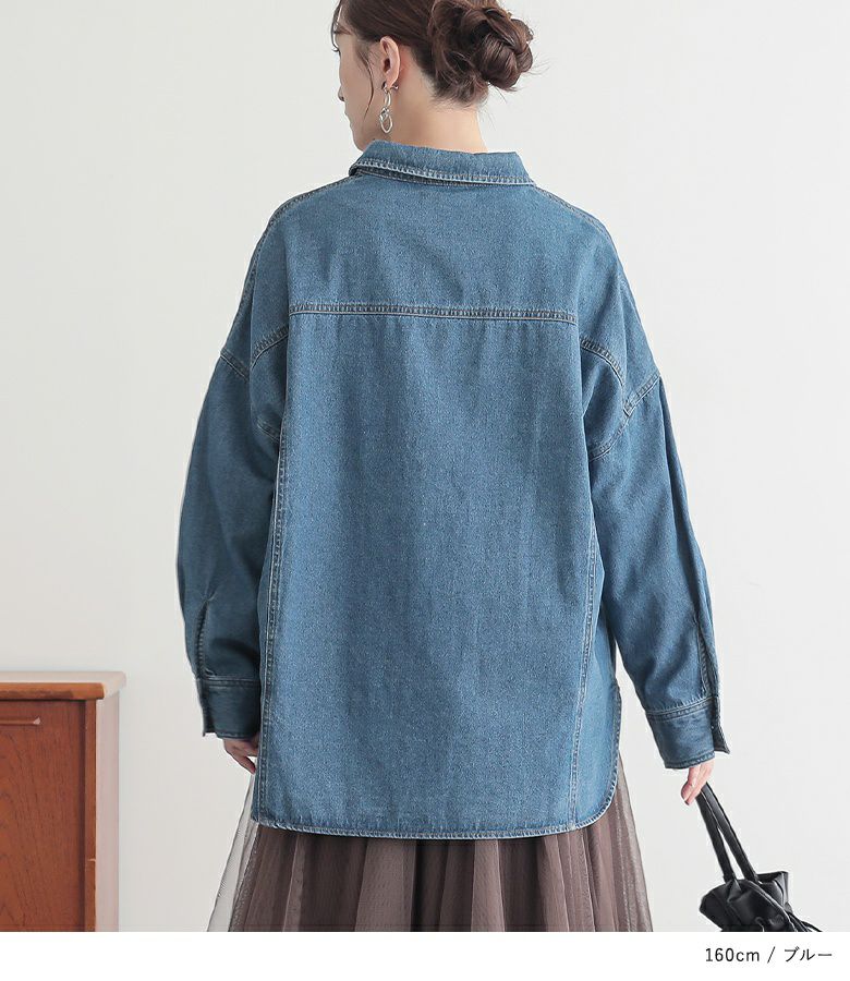 大きめのフロントポケットをウエスト部分につけた、ゆったりデニムシャツジャケット。