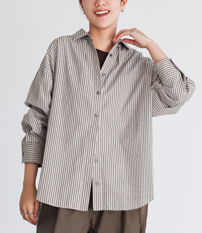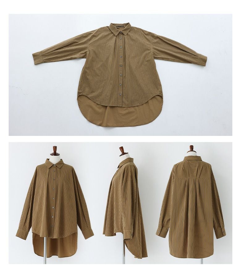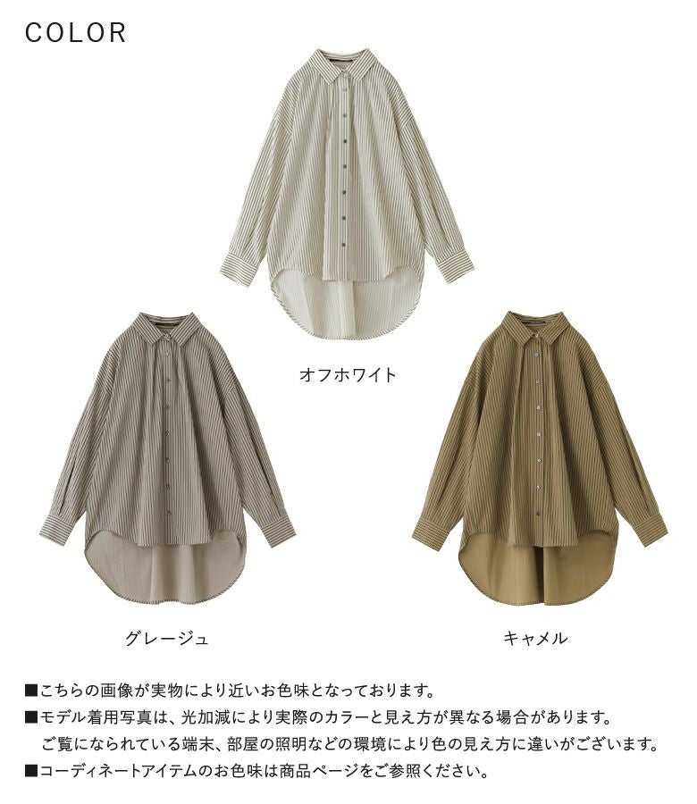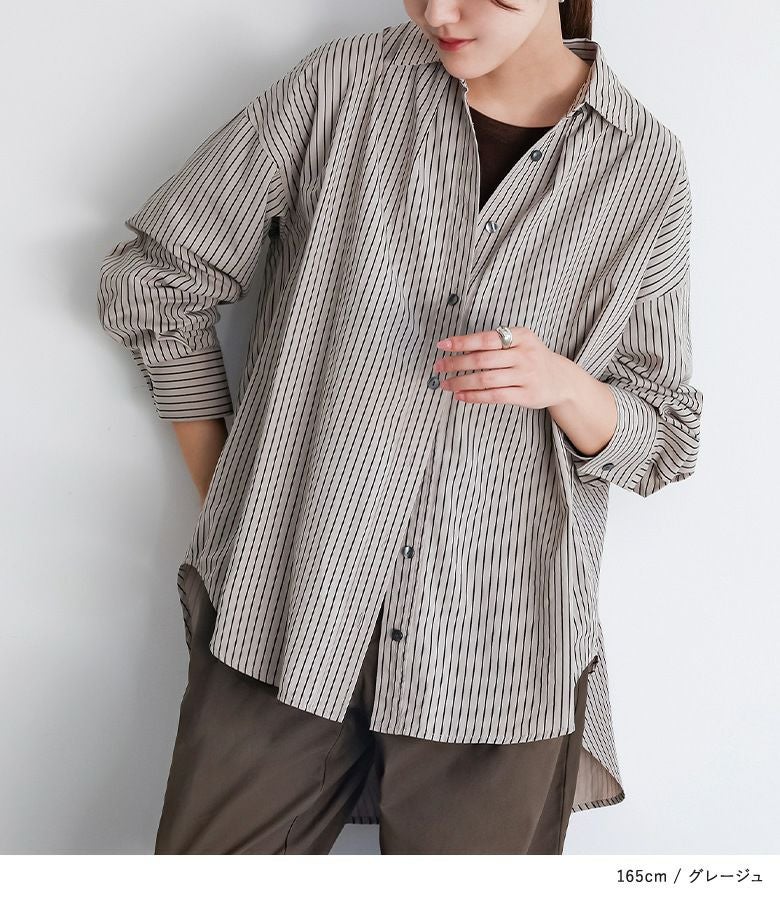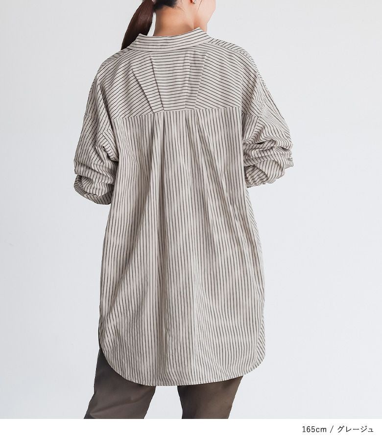お尻がすっぽり隠れる長めの着丈が特徴的なストライプシャツ。シンプルながらも、後身頃のタックの切り替えでさりげなくポイントをプラス。1枚着ではもちろん、羽織としても万能に使えるアイテムです。