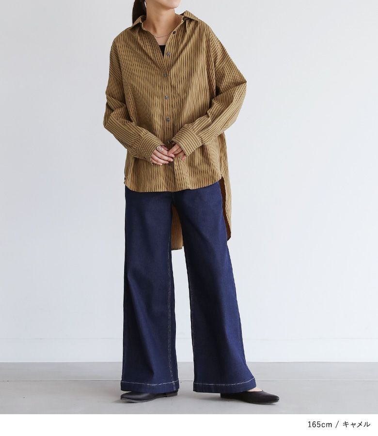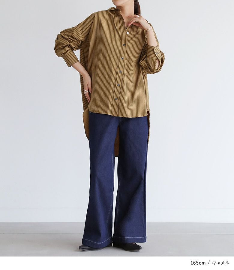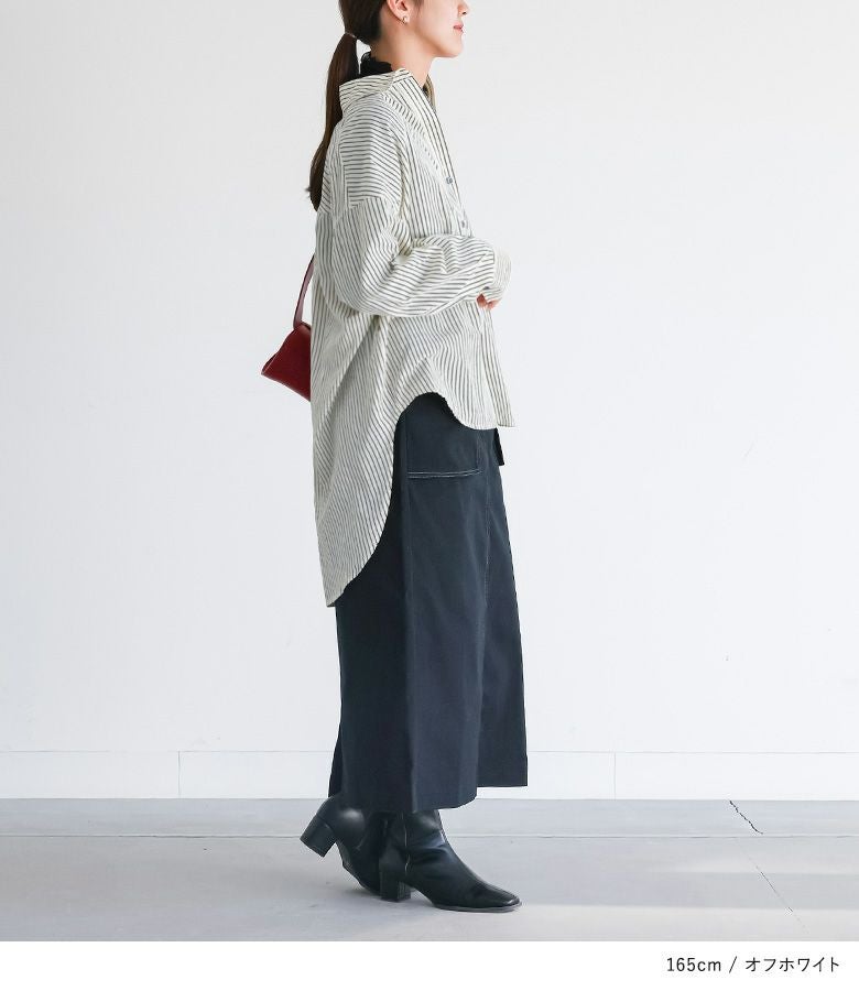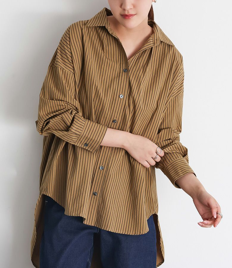 お尻がすっぽり隠れる長めの着丈が特徴的なストライプシャツ。