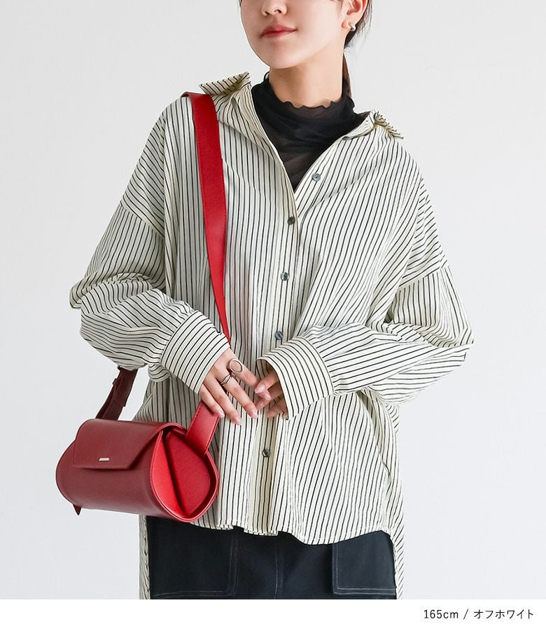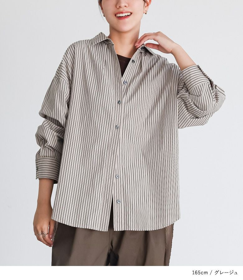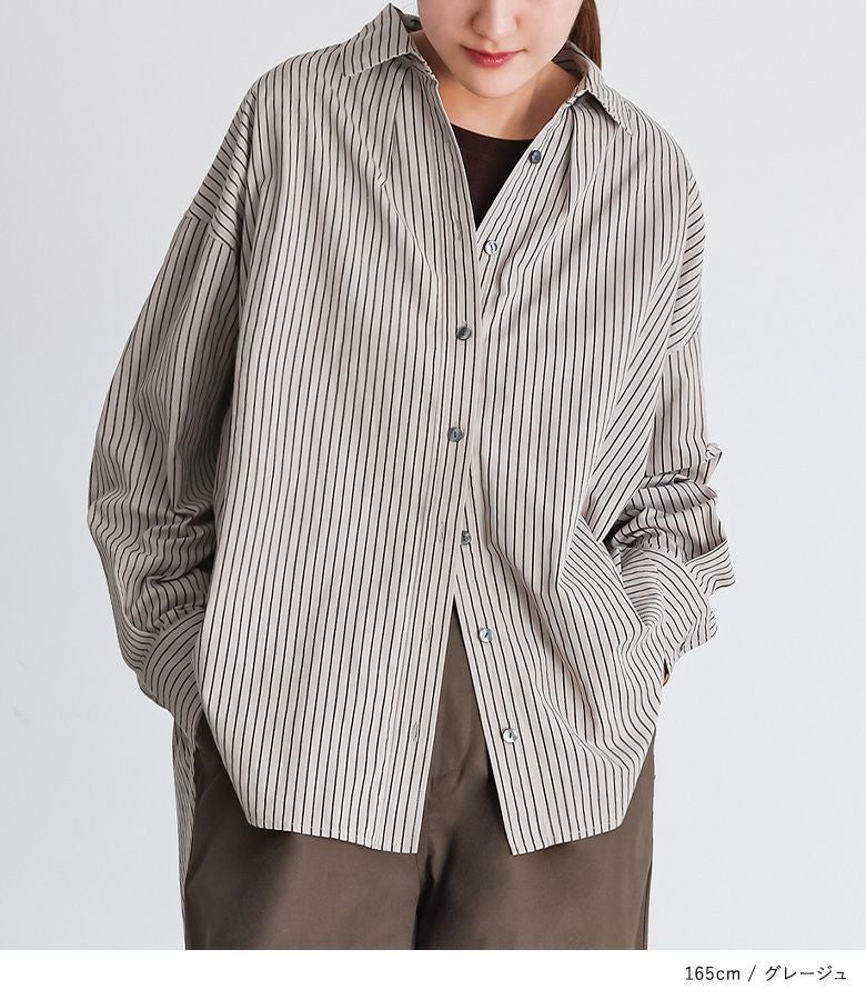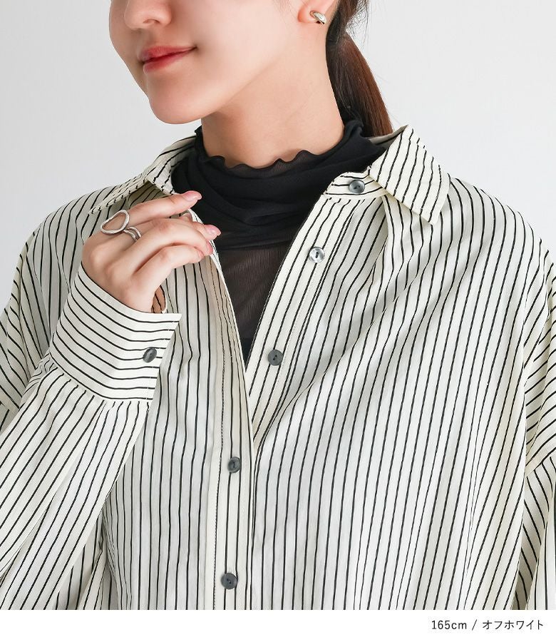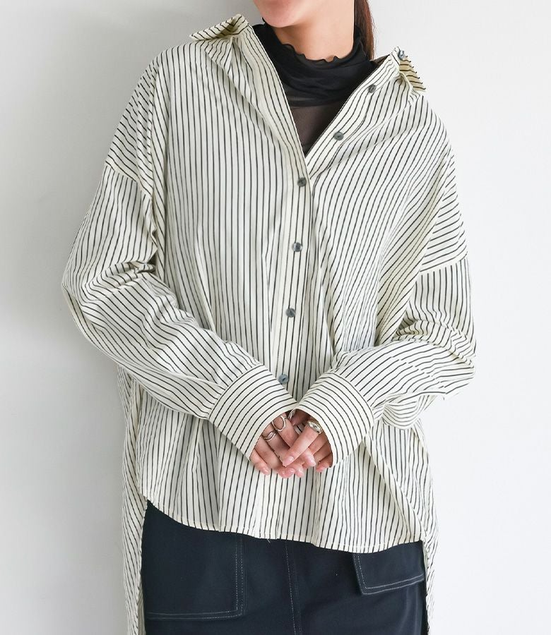 お尻がすっぽり隠れる長めの着丈が特徴的なストライプシャツ。