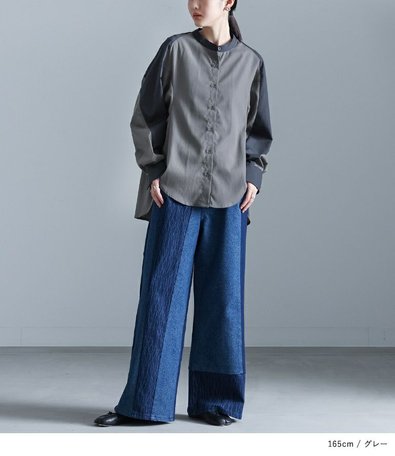アームホールの丸いラウンド配色切り替えが特徴的なシャツ。グレーは無地の生地配色、ブラックはストライプと切り替えてそれぞれに違った印象に仕上げています。丸みのあるシルエットですが、腕を上げやすいようにこだわりました。前後差のある着丈で抜け感をプラスできるのも嬉しいポイント。