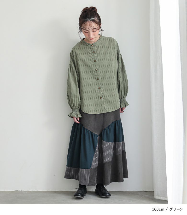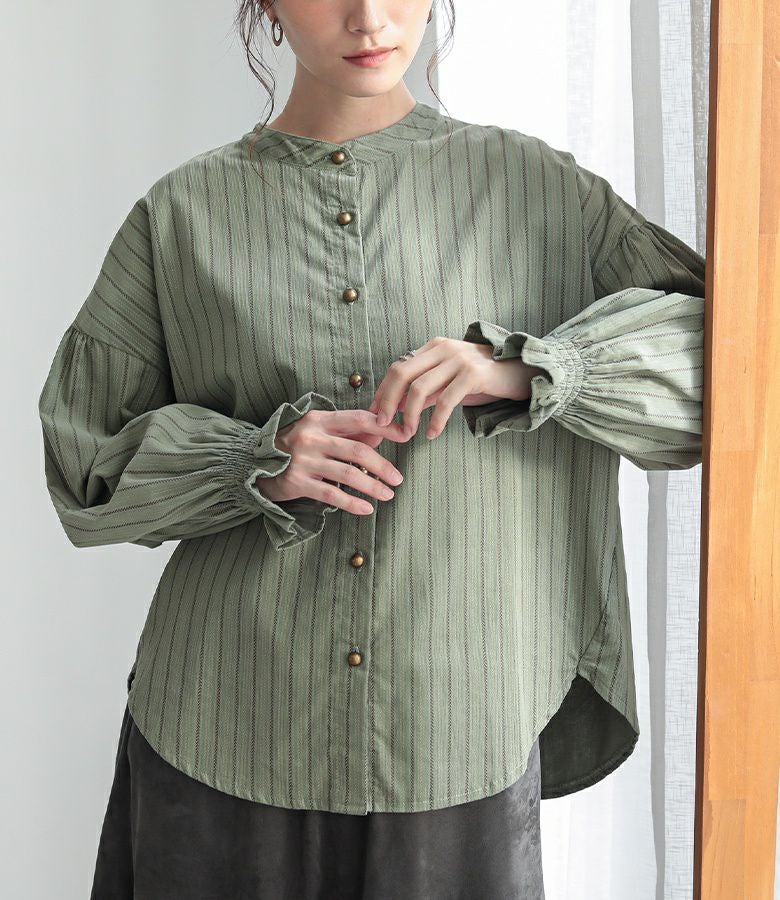 グリーンがキレイなブラウスです。パンツにもスカートにもよく合いそうです。