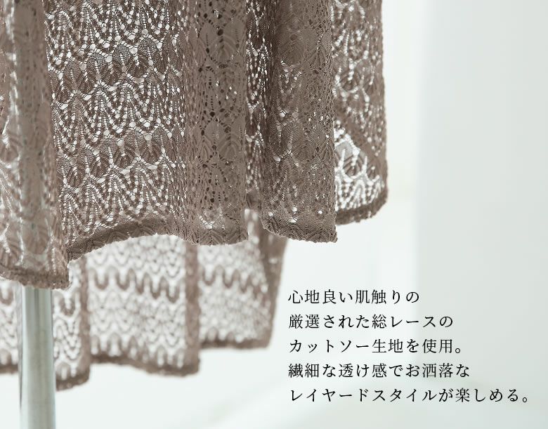 ずっと着ていたくなるほどの柔らかく心地良い肌触り。厳選された総レースのカットソー生地は繊細な透け感があり、お洒落なレイヤードスタイルが楽しめます。