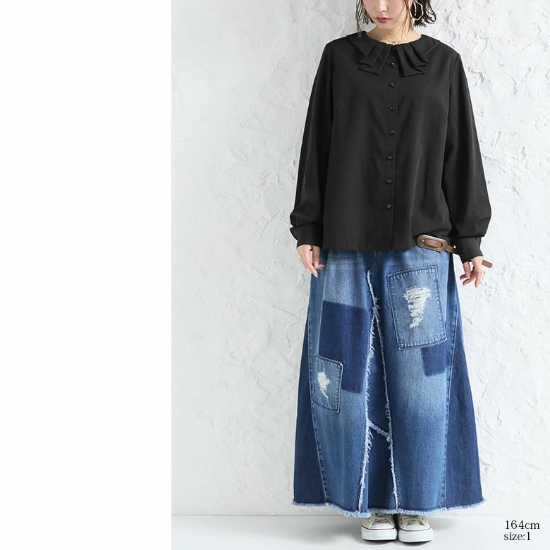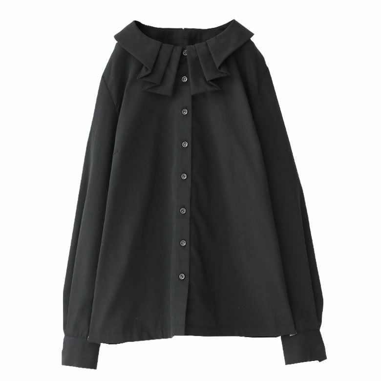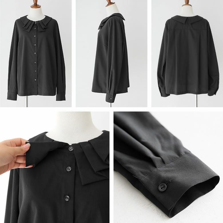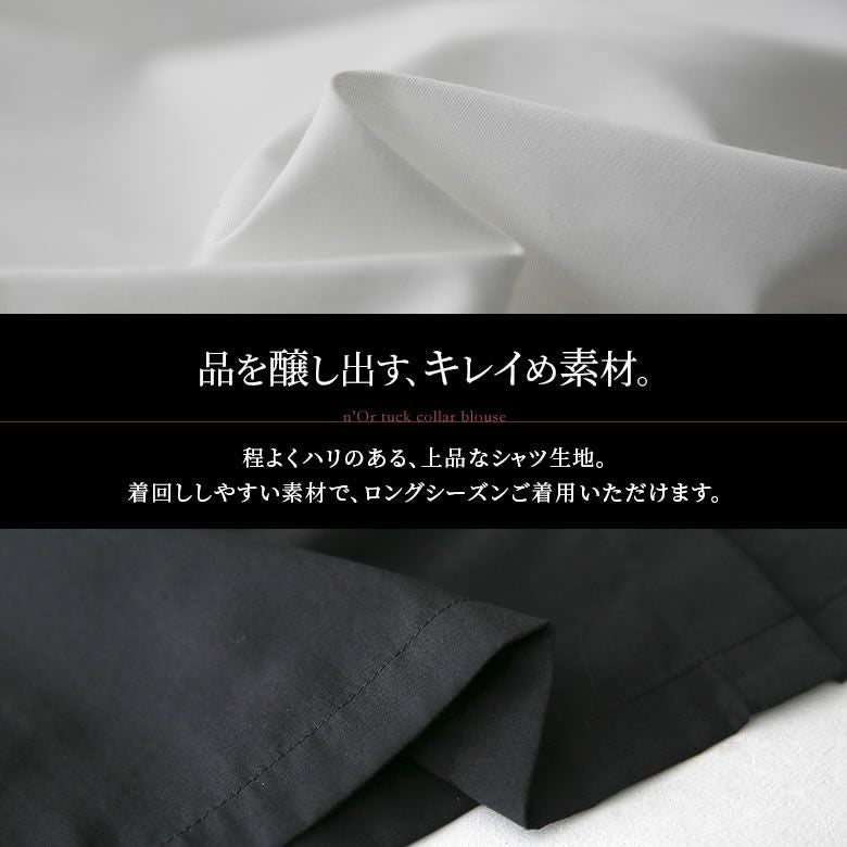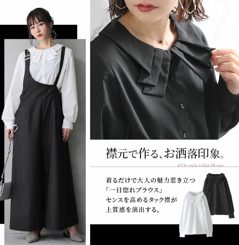 襟元でお洒落印象をプラスするタック襟ブラウス。