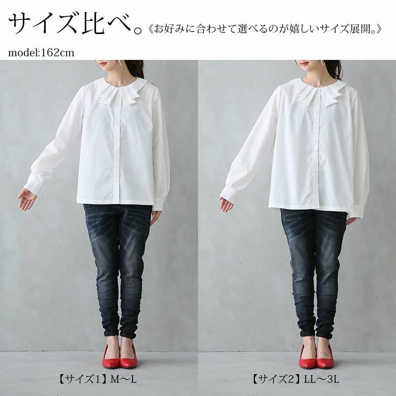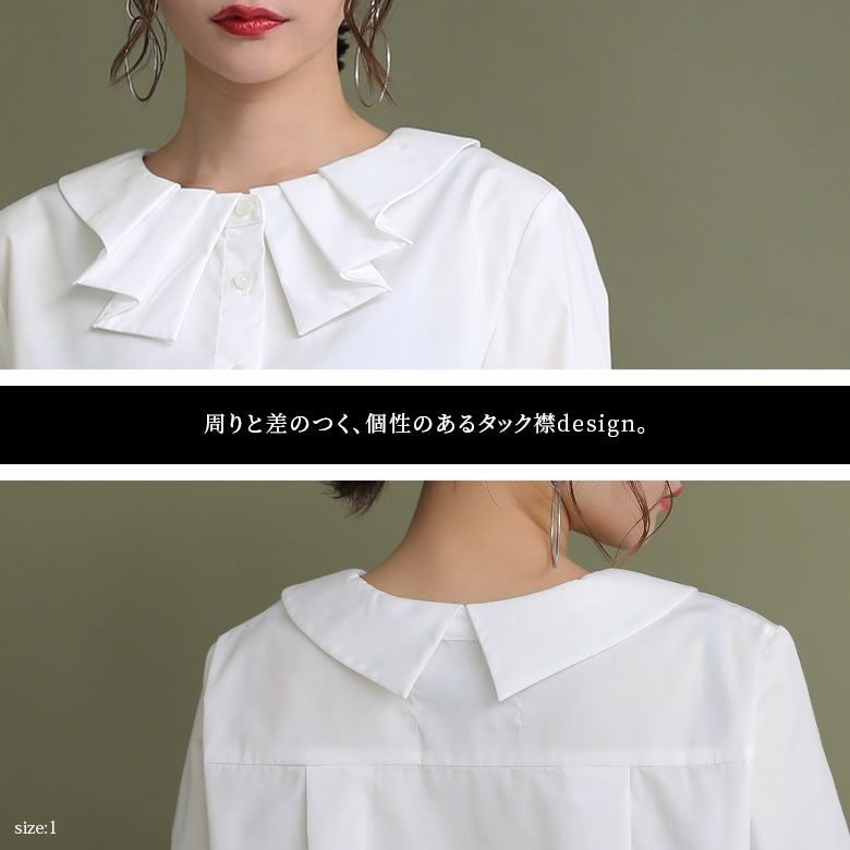 センスを高めるタック襟デザインが上質感を演出してくれる。さらに、お好みで選べるM~3Lサイズ展開も、嬉しいポイント。