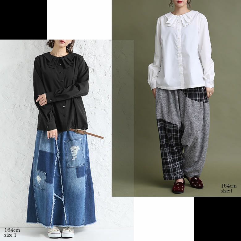 大きい方を買いました。ちょうどよかったです。襟の形が甘すぎず奇抜すぎず、いろんなファッションに合わせやすいのがとってもよいです。