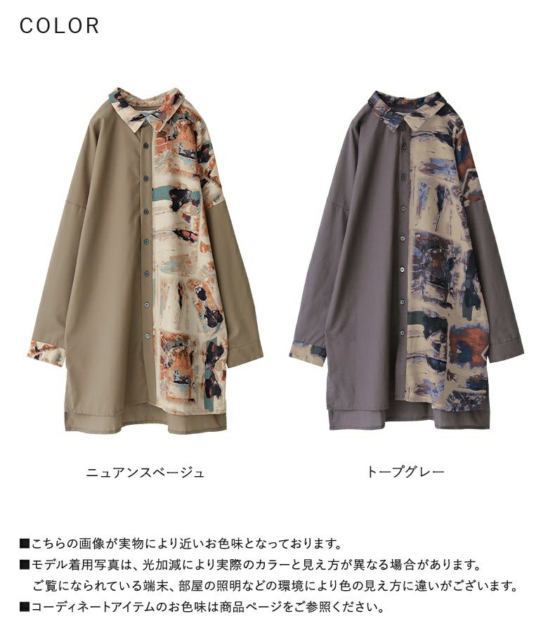 こだわりの配色バランスでこなれ感を演出するアートプリント×無地ロングシャツ。