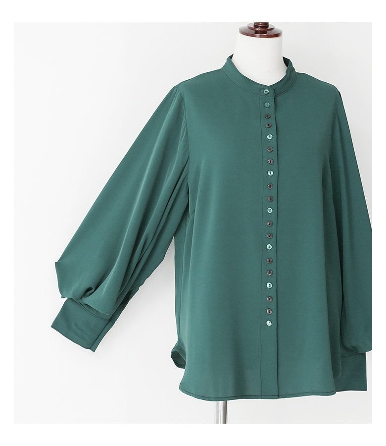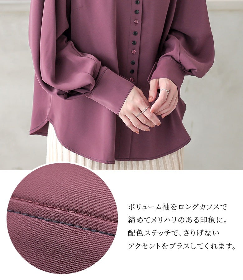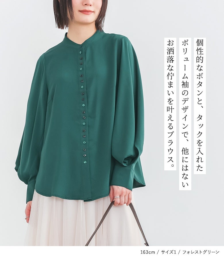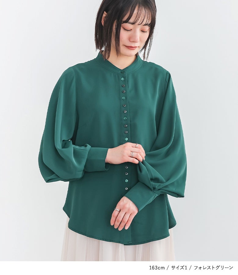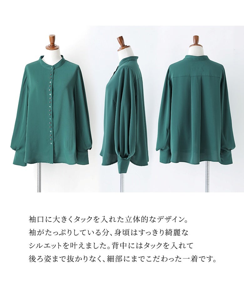 "袖コンシャス"なデザインが、着こなしに華を添えてくれる、バンドカラーブラウス♪