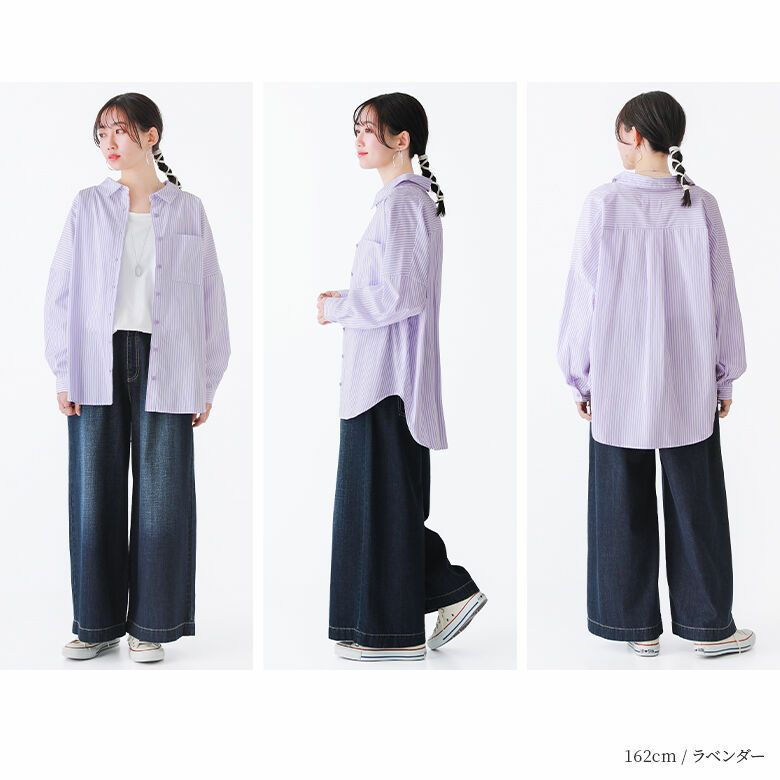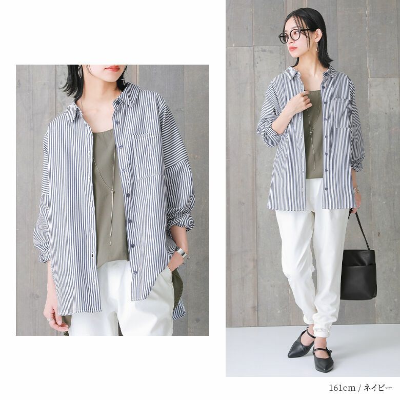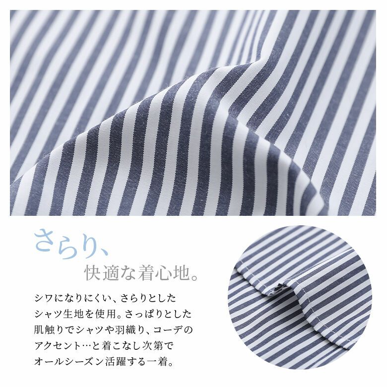 さらりとしたシワになりにくいシャツ生地を使用。着こなし次第でオールシーズン活躍する素材感です。