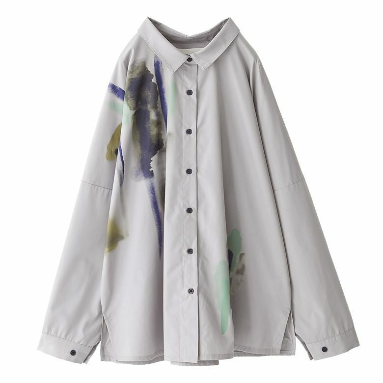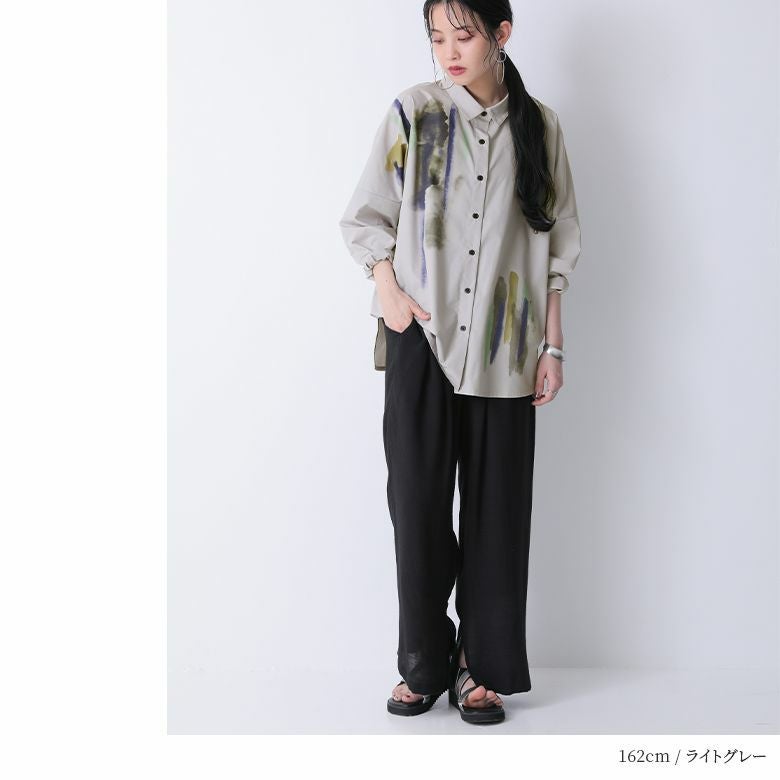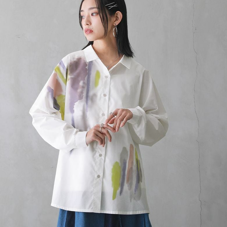 印象的な水彩画とゆったりシルエットで、こなれ感漂うプリントシャツ。