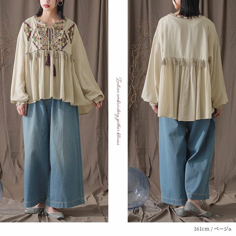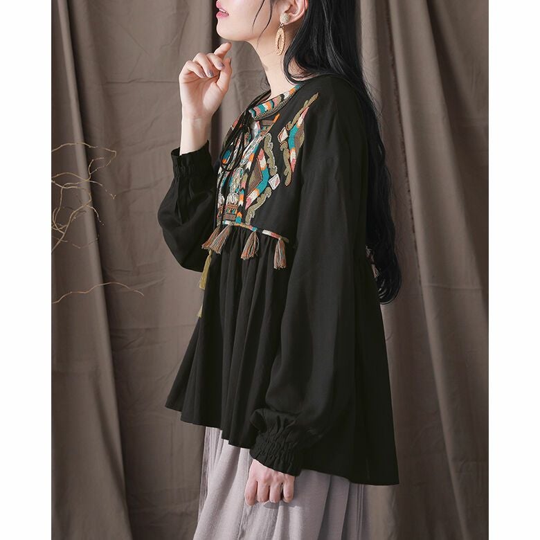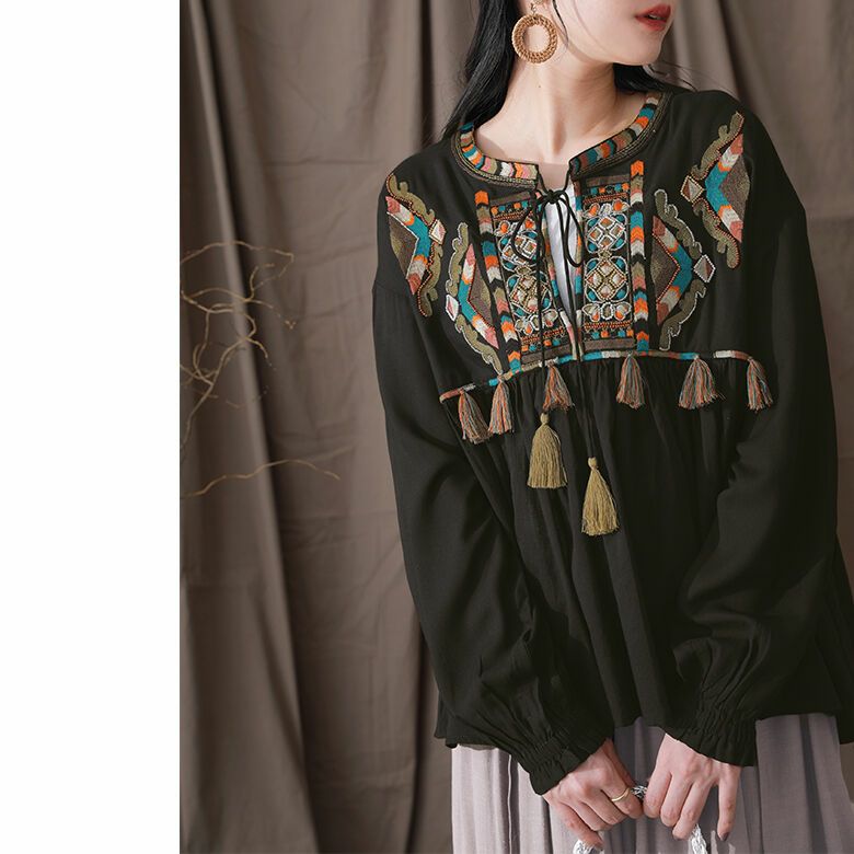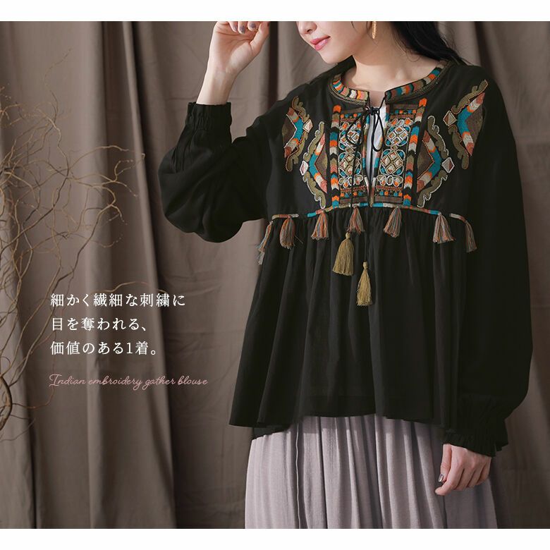 贅沢にビーズ刺繍やフリンジなどを施したフレアブラウス。インド刺繍ならではの高級感のある独特な風合いを楽しめる。ボリュームたっぷりのふんわりとしたシルエットで、印象的な佇まいへ導きます。