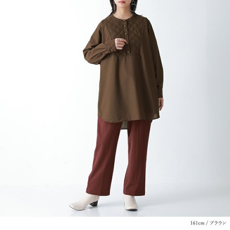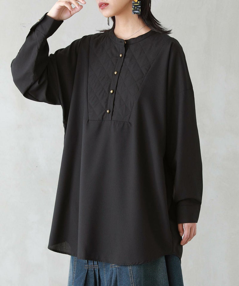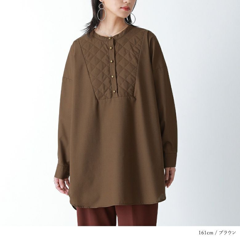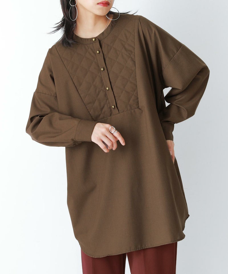 キルティング柄で切り替えたブザムデザインがシーズンムードを漂わせるトップス。