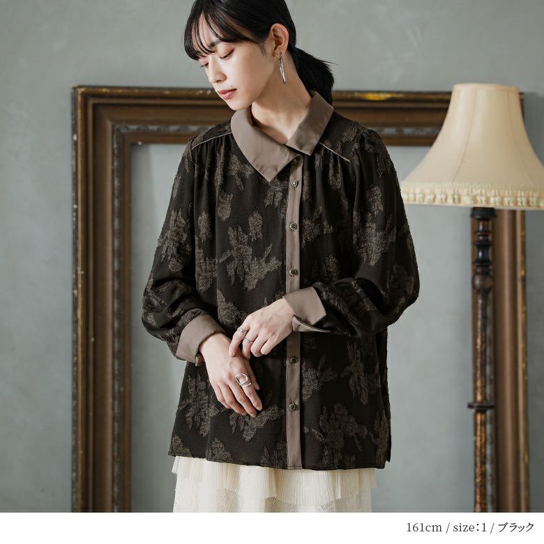 レトロでモードな世界観に導くフラワー配色ブラウス。