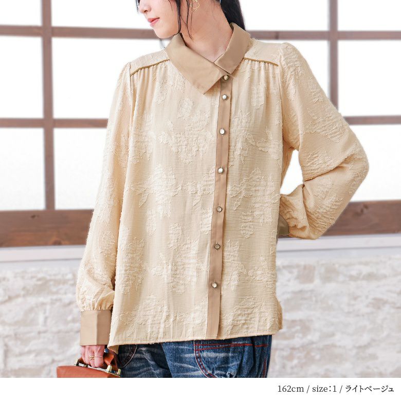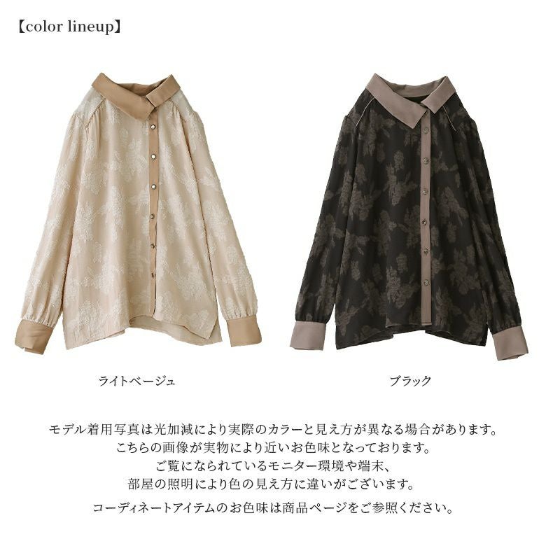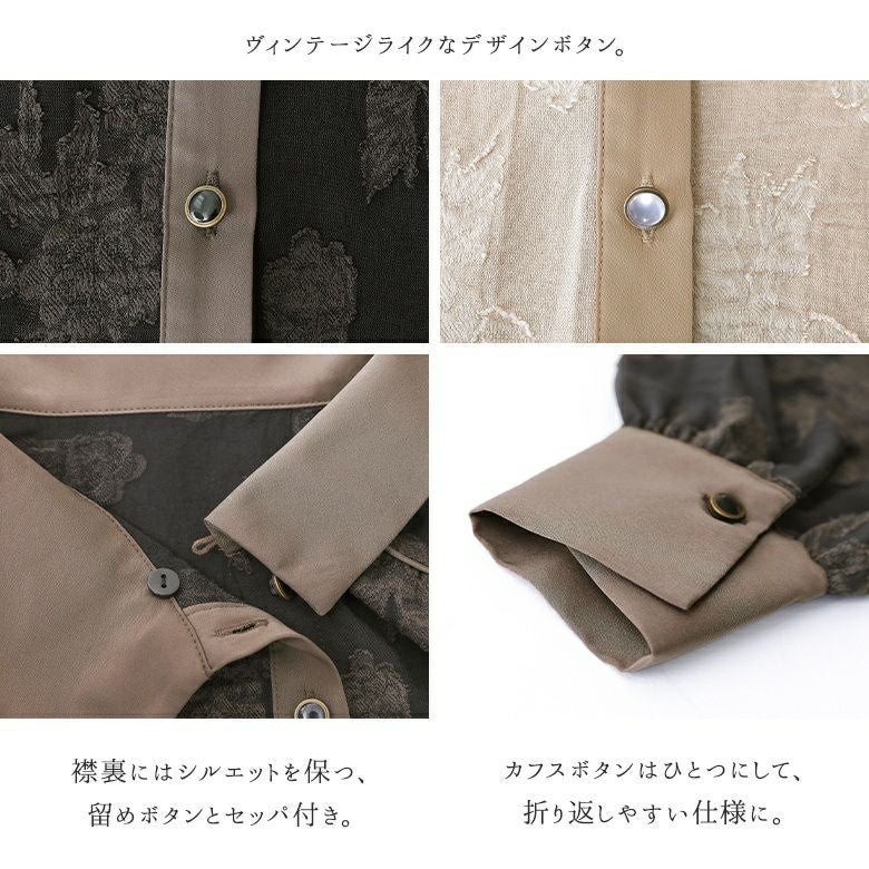 柔らかく落ち感のあるカットジャカード生地とさりげなく光沢感のあるマットサテン生地の異素材ミックス。薄手でさらりと着られる素材感でこれからのシーズン活躍してくれる。襟と前立てはアシメデザインでアクセントに。