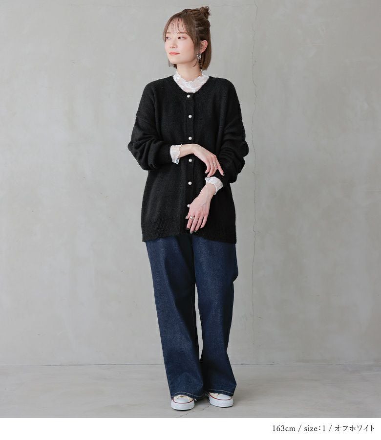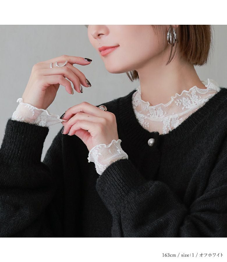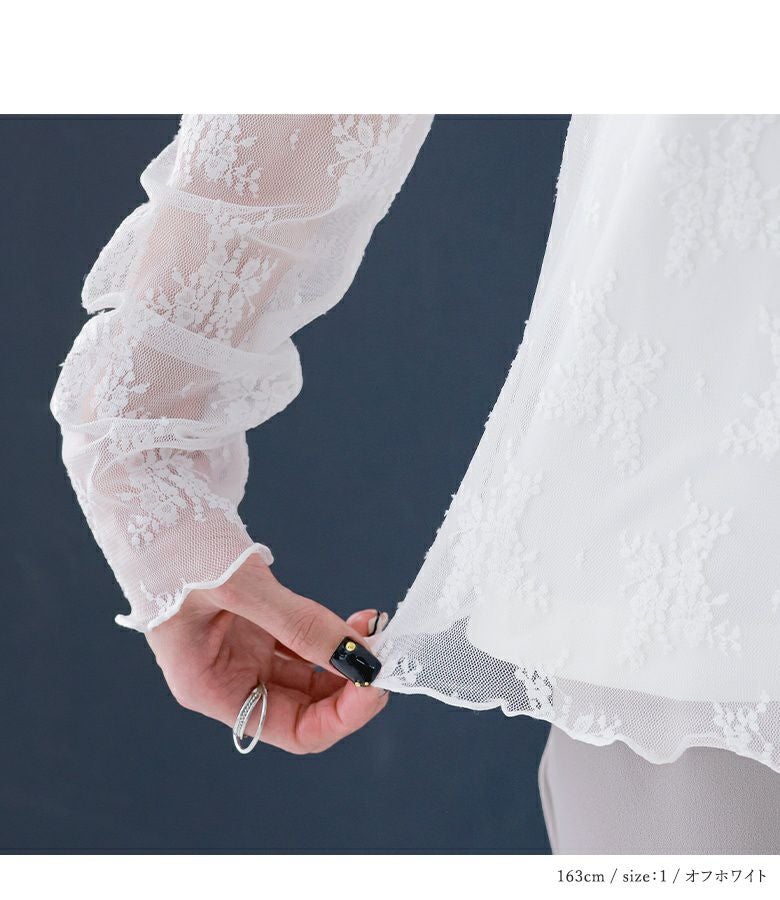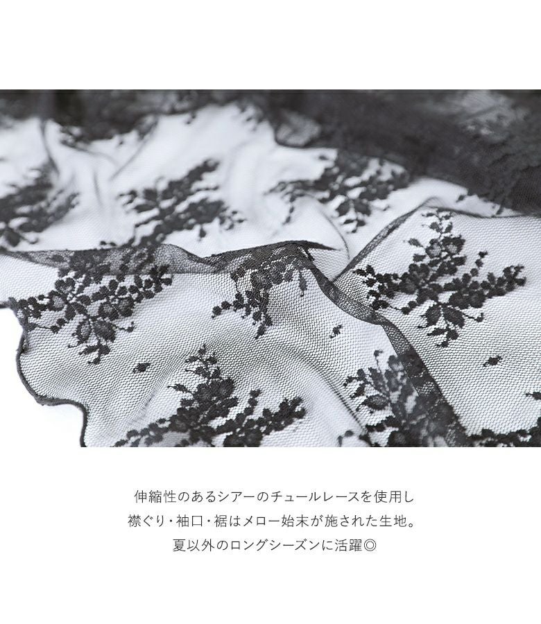 伸縮性のあるシアーのチュールレースを使用し、襟ぐり・袖口・裾はメロー始末が施された生地。夏以外のロングシーズンに活躍します。