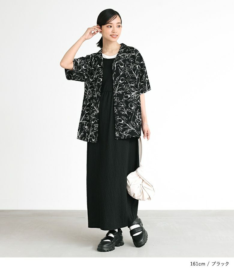 シンプルなボトムスに合わせるだけで、リラックス感のある涼し気なカジュアルスタイルに。デニムやワンピースに羽織りとして合わせても◎