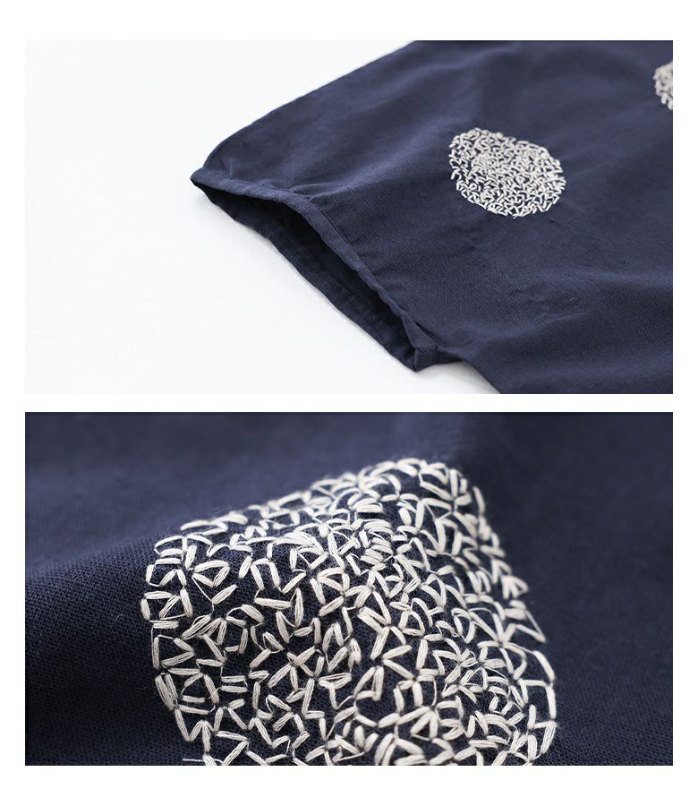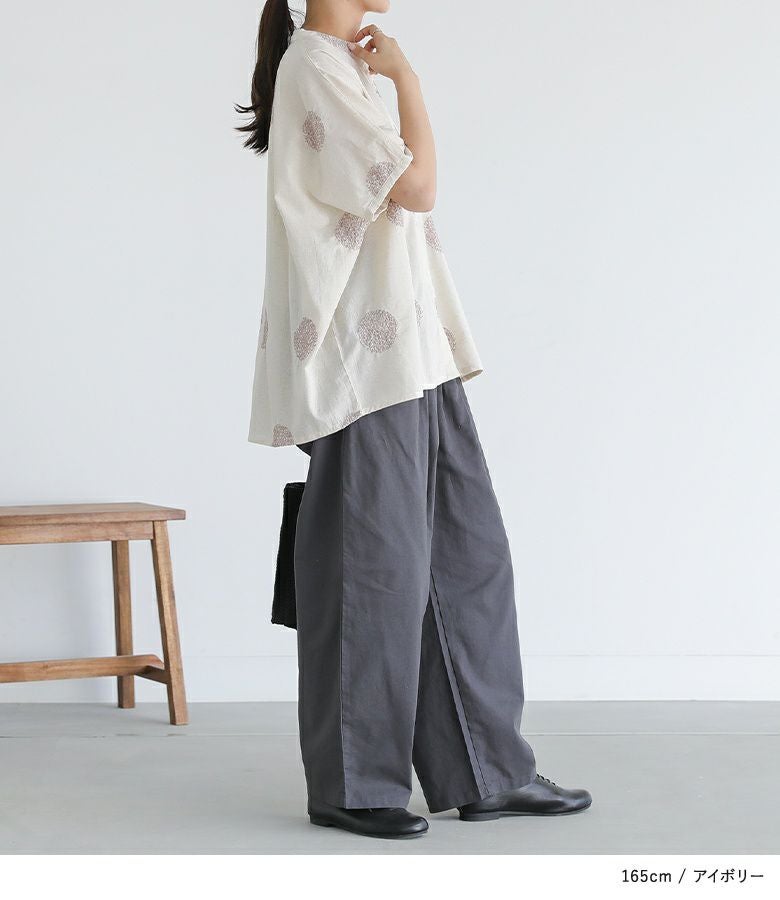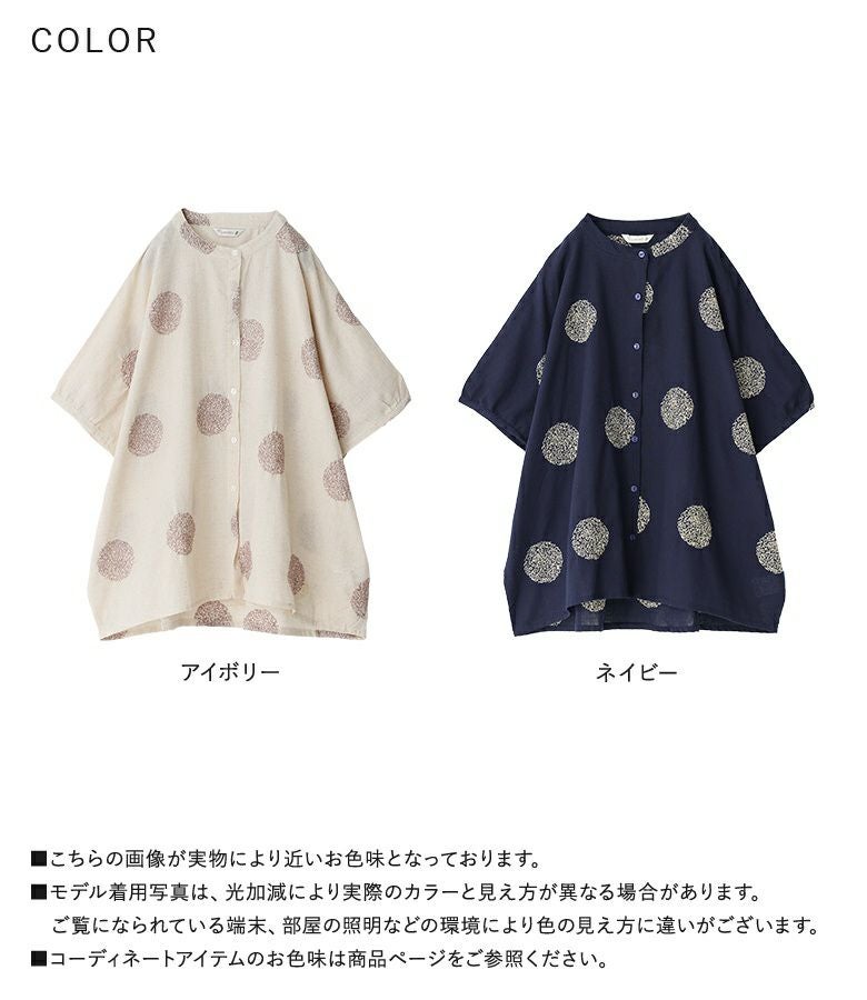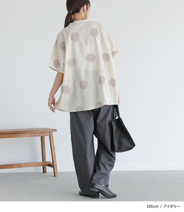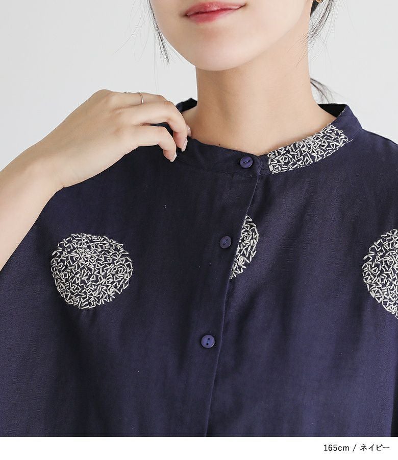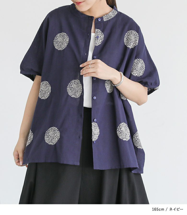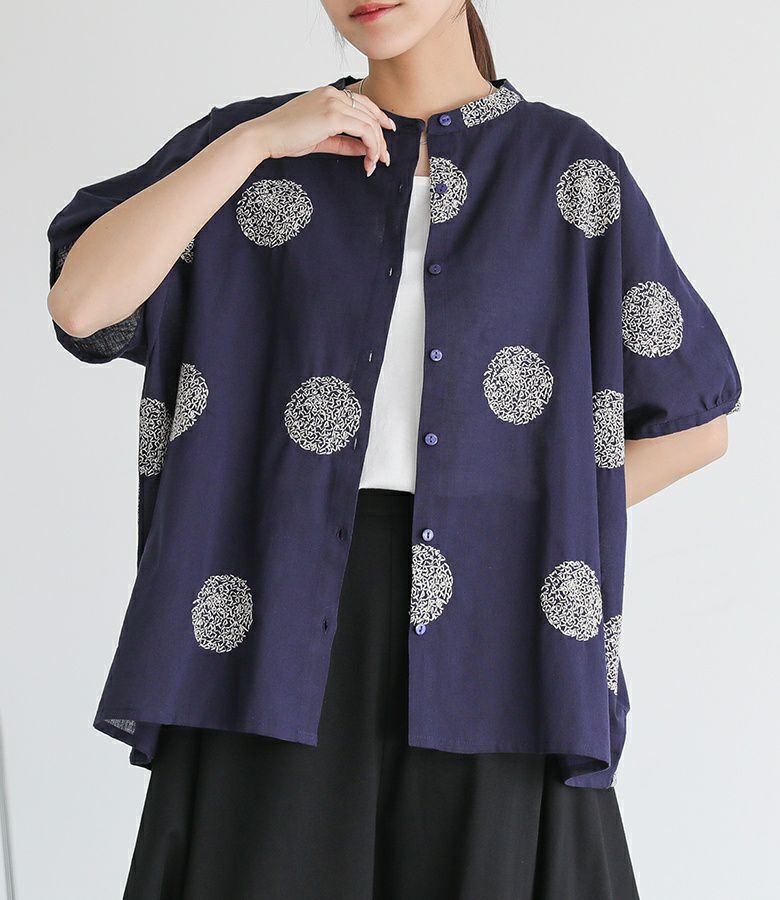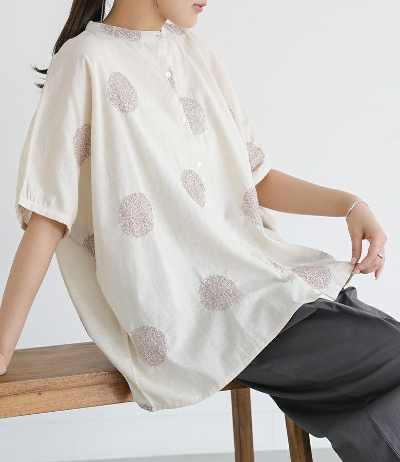 ドット柄を刺繍で表現した、大人の遊び心を感じるデザイン。ゆったりとしたシルエットで、抜け感のある着こなしに。首元はバンドカラーですっきりと。少し丸みのある袖シルエットで、やわらかさと程よいモード感をプラスしてくれます。