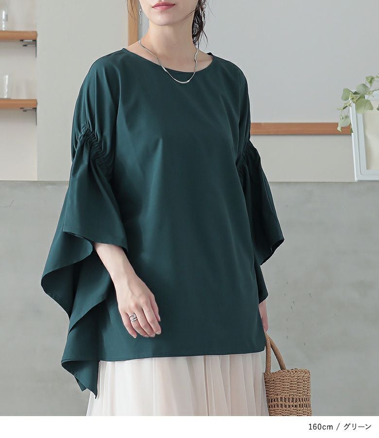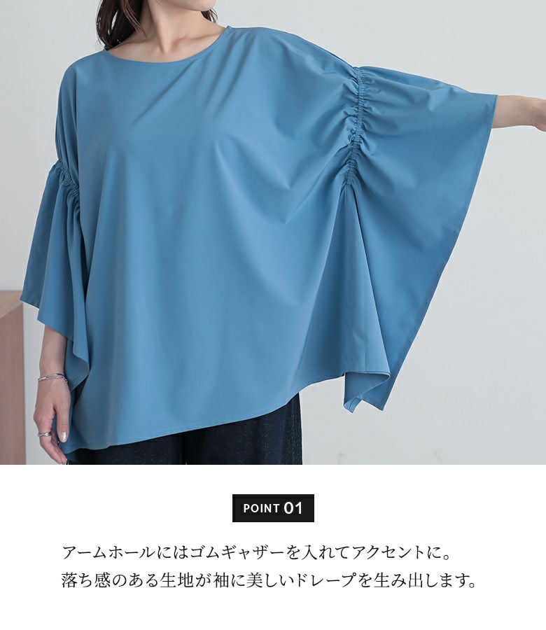 袖のギャザーで動きのある印象的なドレープを生み出すポンチョブラウス。