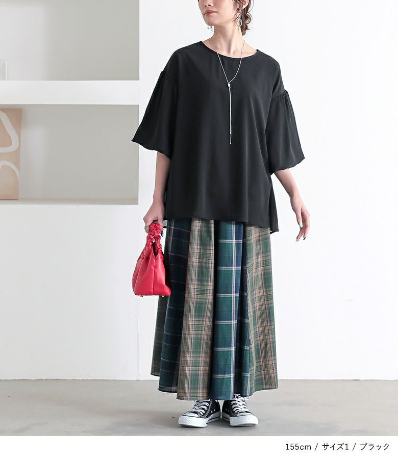 【普段着用】 Tops: M Bottoms: M/L | 【1】 袖丈:ひじ下7cm位 着丈:ヒップがちょうど隠れる位 腕周り:ややゆったり バスト:ゆったり 全体:ゆったり