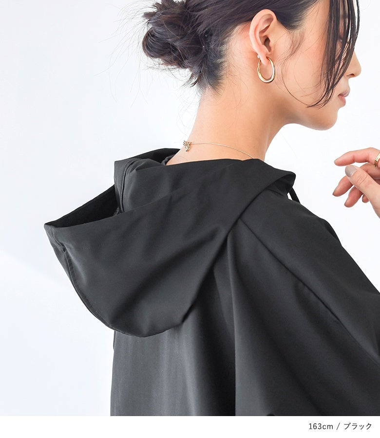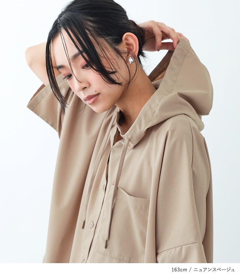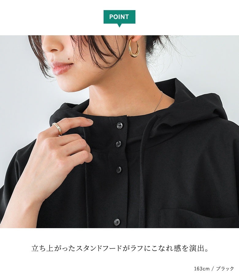 立ち上がったスタンドフードがラフなこなれ感を演出。ほんのりドルマン袖と、ラウンドした裾の着丈差でゆるっと抜け感の出る着こなしを実現します。