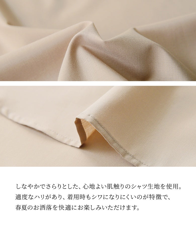 肌触りが良く、シワになりにくいシャツ生地を使用。しなやかで程よいハリがあり、綺麗な落ち感が大人の雰囲気を放ちます。
