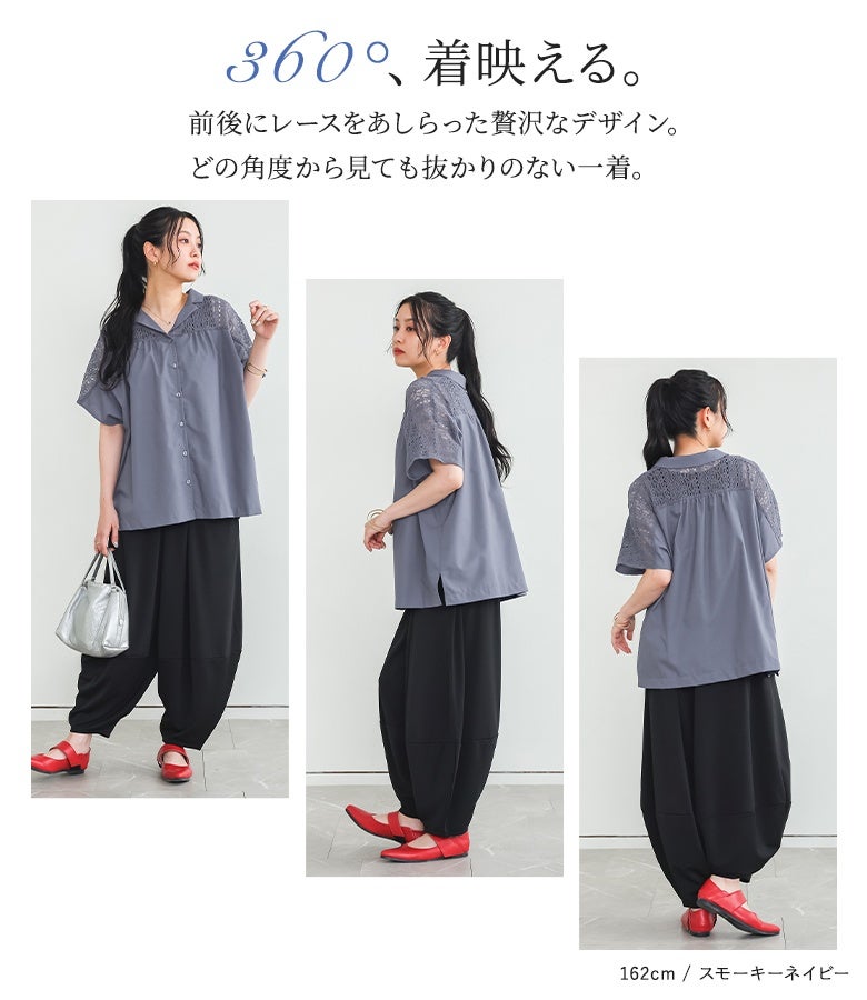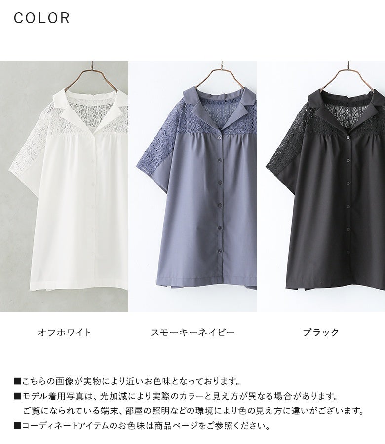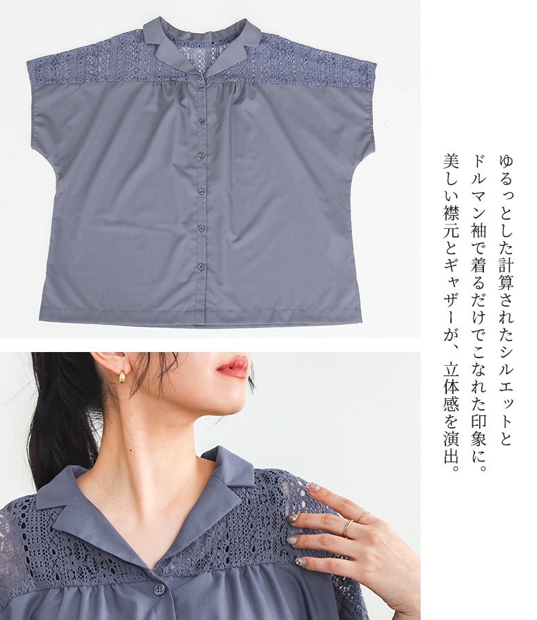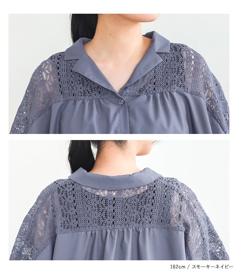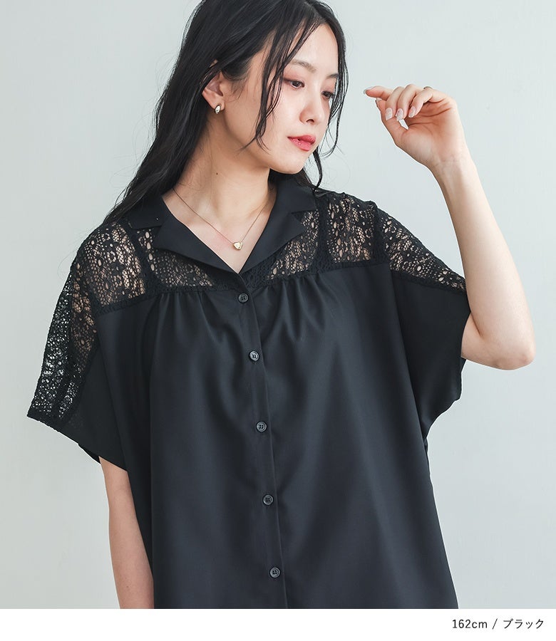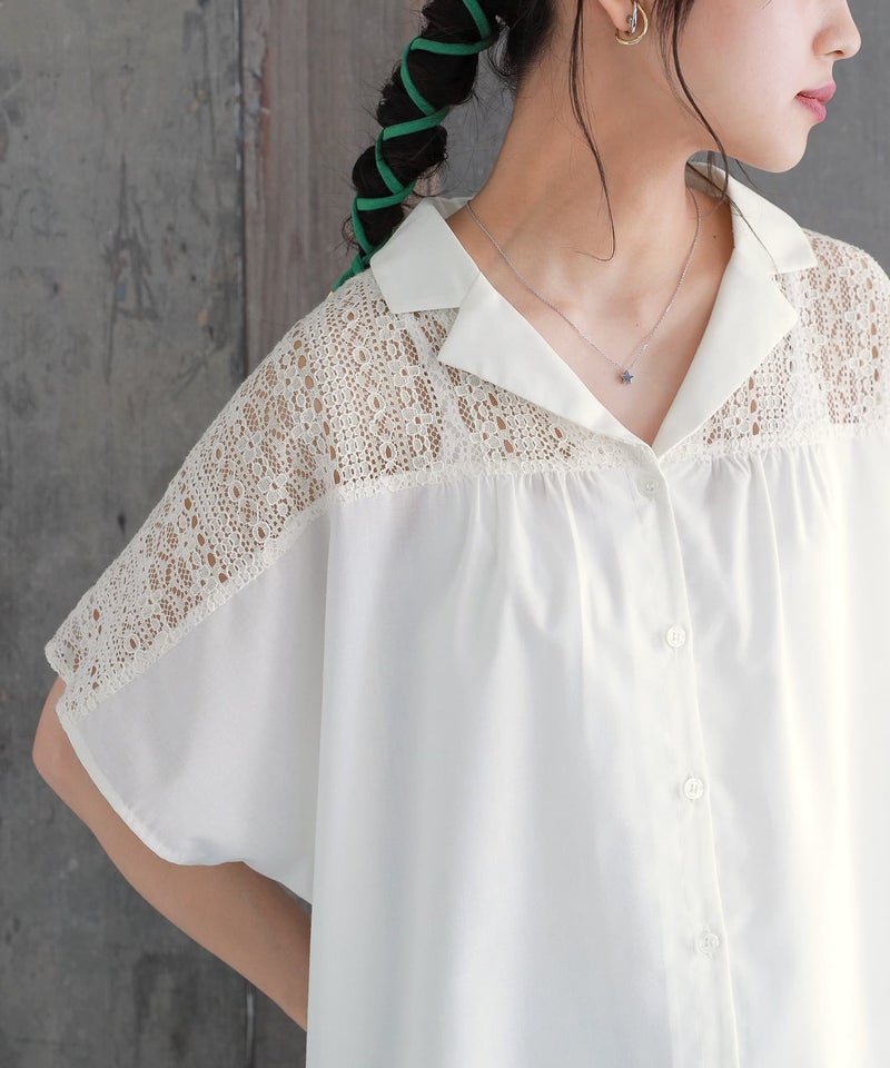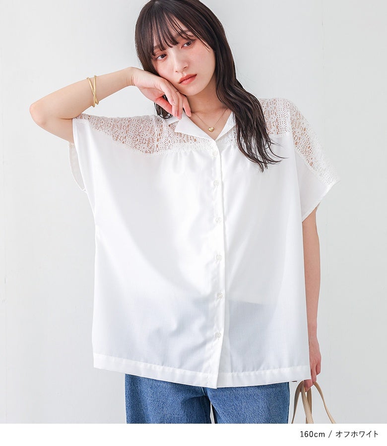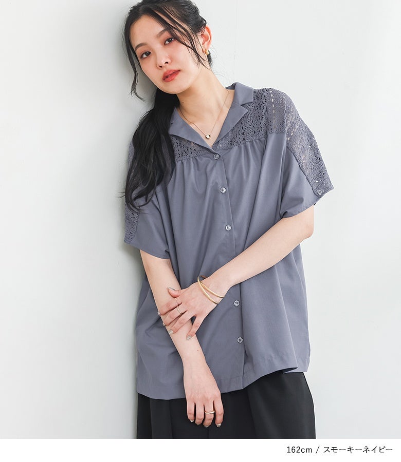 甘さ控えめな柄のレース切替で、大人っぽく着られる開襟シャツ♪