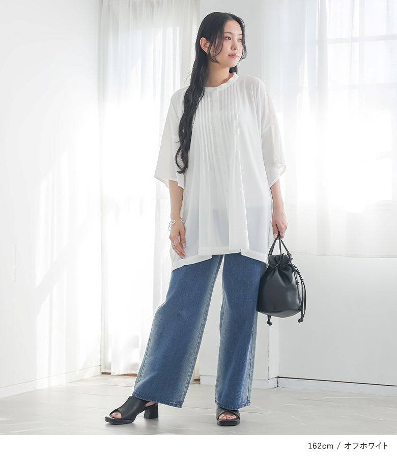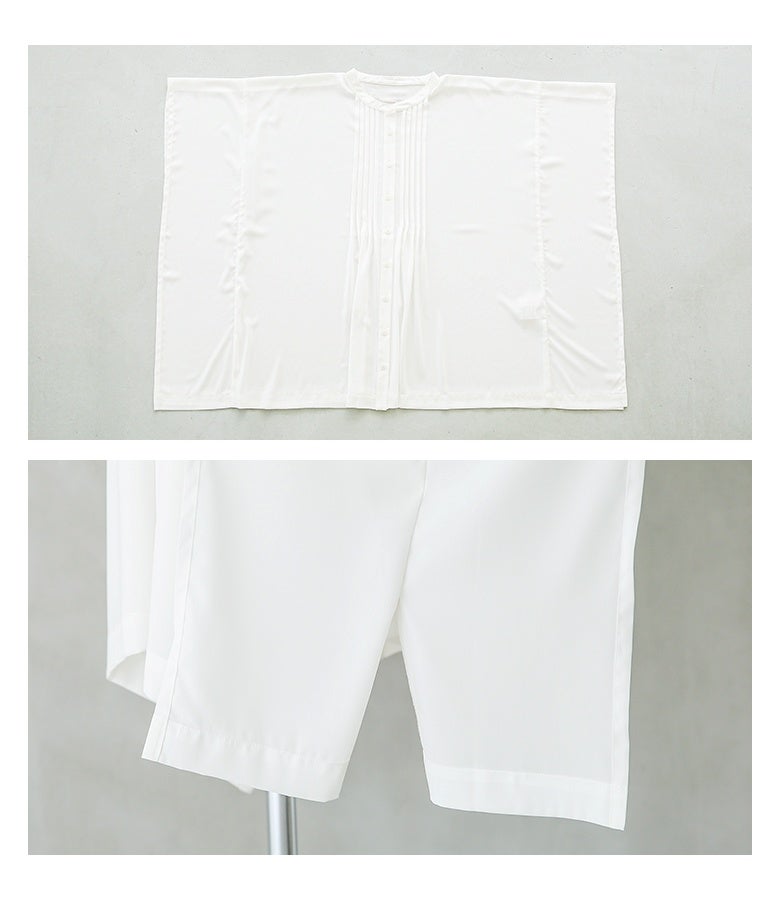 襟元をすっきりと見せるバンドカラーと、胸元のピンタックデザインが旬な着こなしに仕立ててくれる。