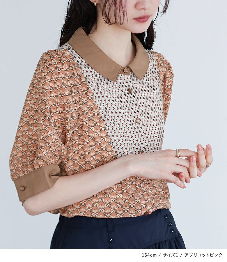 2種類のレトロ柄×無地のデザインが視線を奪う、個性派ブラウス。ぽわん袖が女性らしさをプラスし、同系色でまとめたニュアンスカラーが落ち着いた雰囲気に仕上げてくれる。