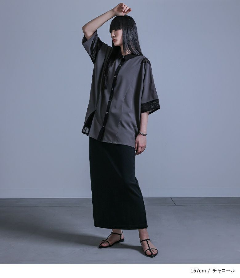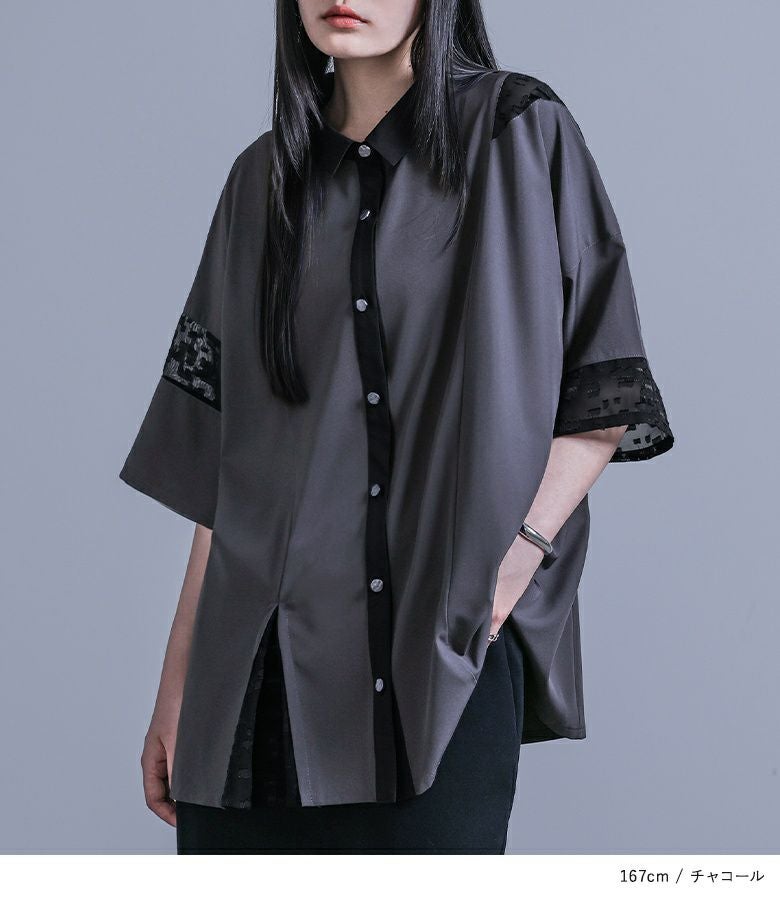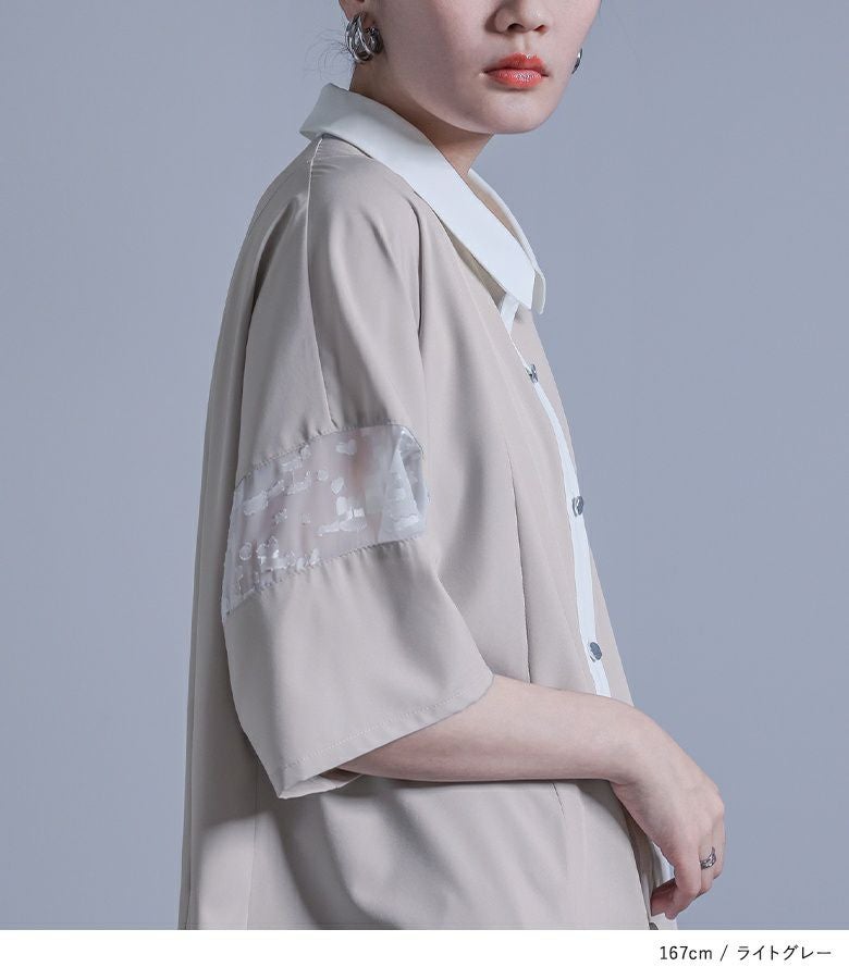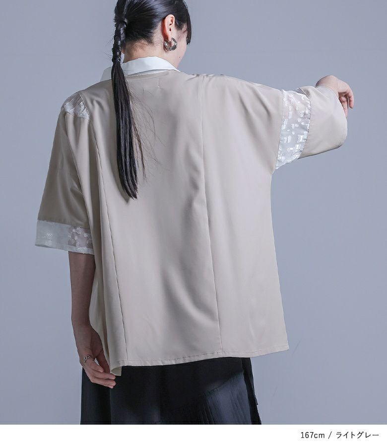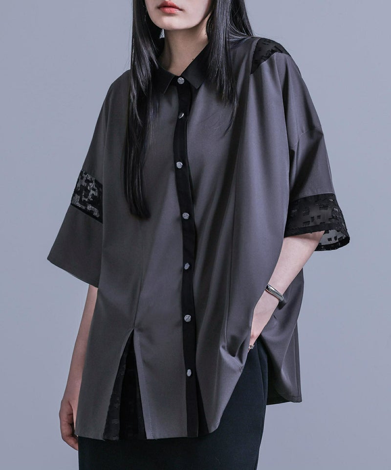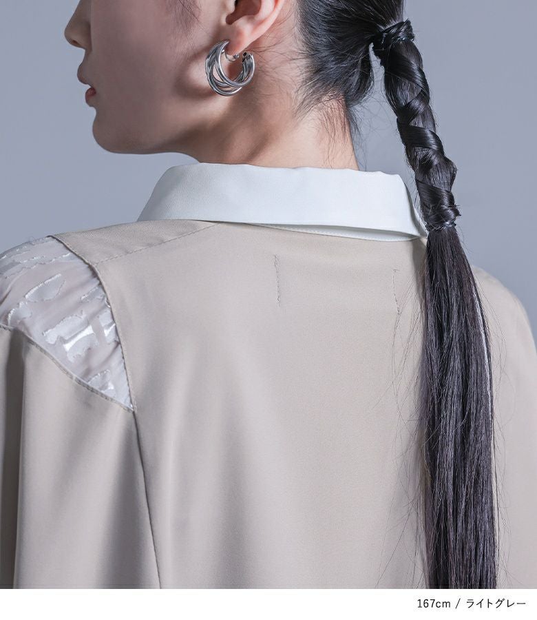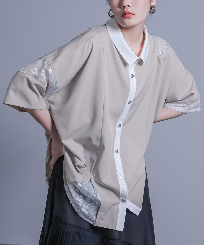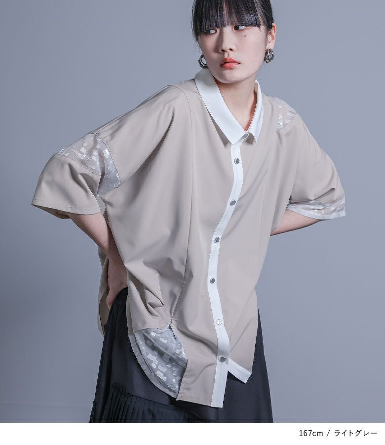 バランス良くアシンメトリーに切り替えた、微配色のシアーカットジャカード生地が大人っぽいモードスタイルに導くデザインシャツ。ニュアンスのある金属調のボタンがアクセントになり、ゆるっとラフなシルエットが着るだけでお洒落を印象付けます。