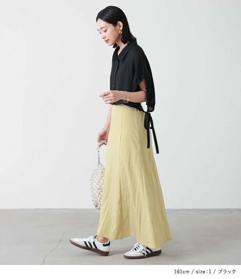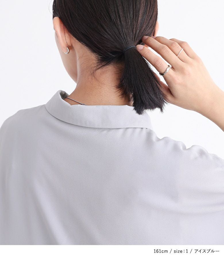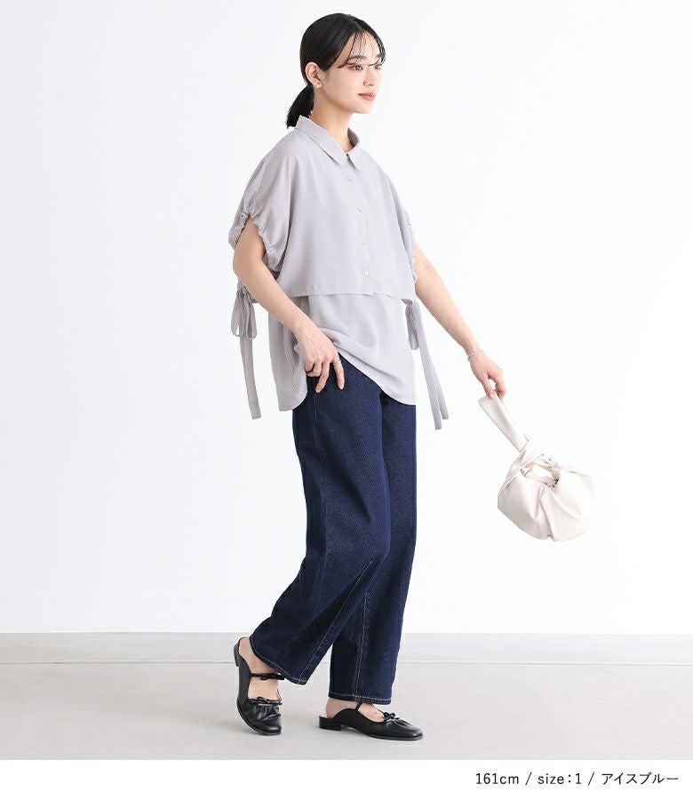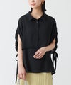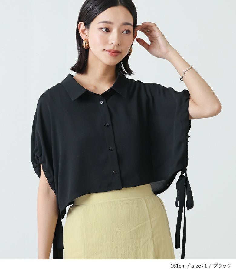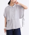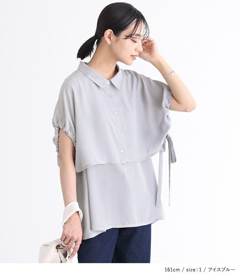 タンクトップの上にケープが重なったようなレイヤード風デザインのシャツ。ノースリーブで暑い時期でも涼しく、ケープで二の腕はしっかりカバーできるアイテムです。サイドのリボンがポイントになったデザインで、絞り具合を調節してアレンジできます。身頃のタンクトップはVネックになっており、シャツボタンを開けて着脱しやすい仕様。