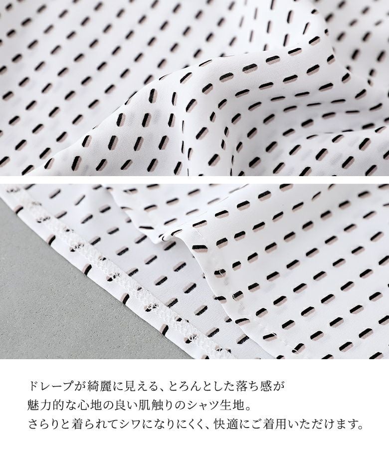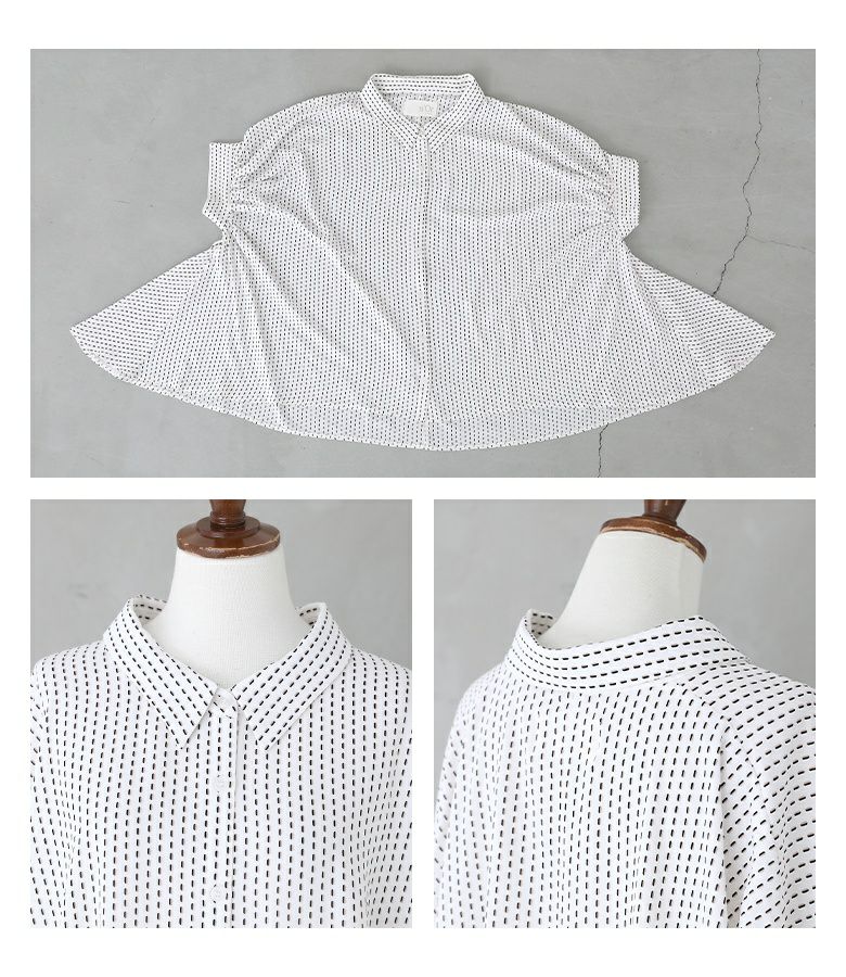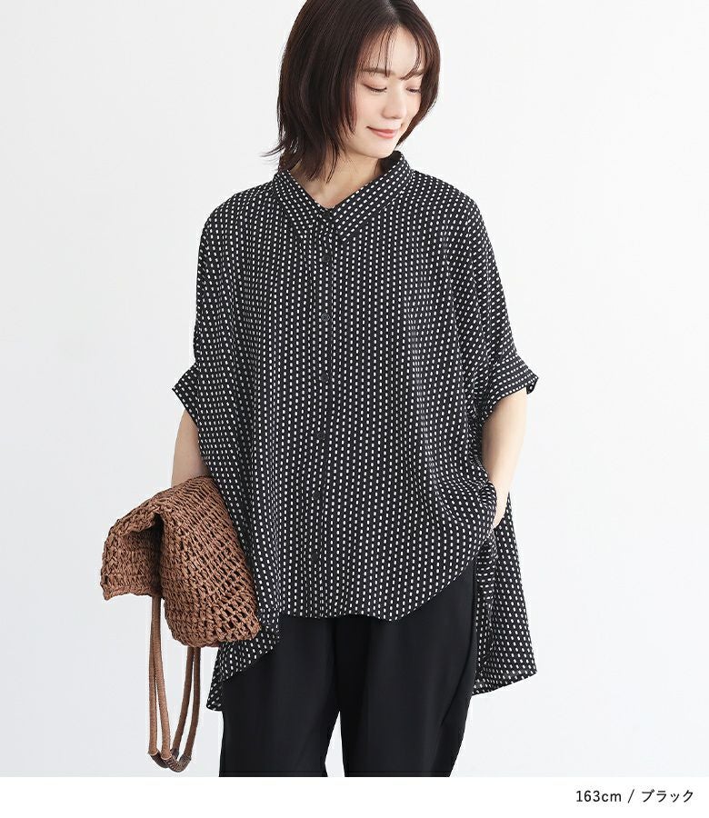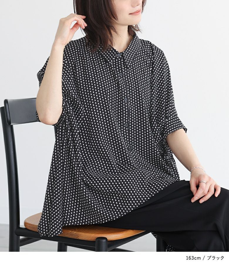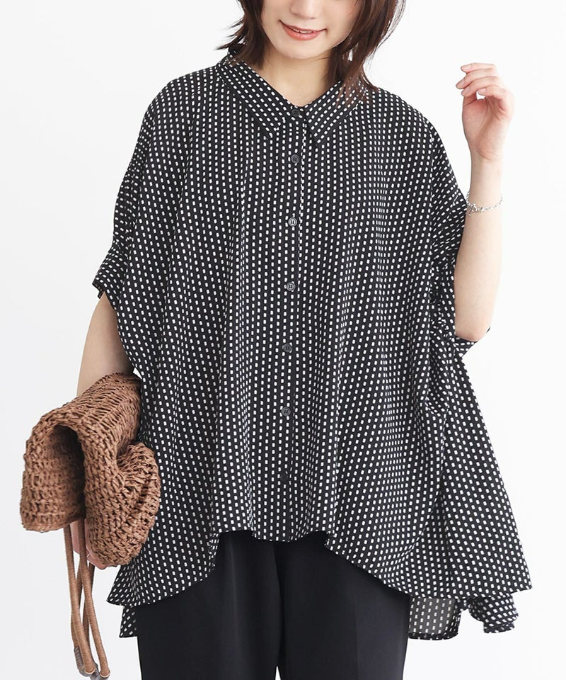 小さい幾何学柄がプリントされたシャツ。袖にたっぷりギャザーを入れ、脇下のドレープになった変形シルエットがポイントになります。丈に前後差をつけたデザインで抜け感を演出し、ヒップもしっかりカバーします。