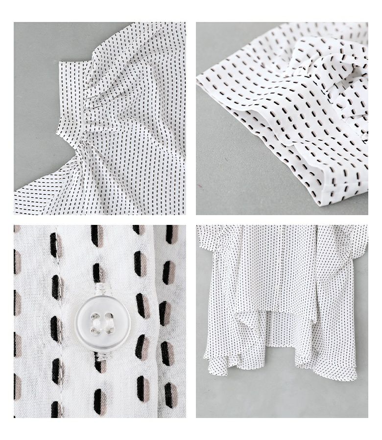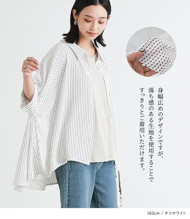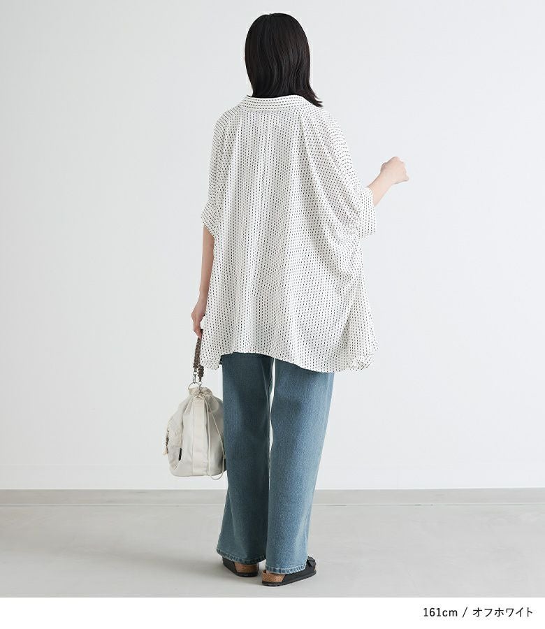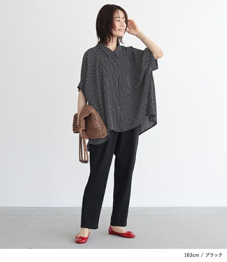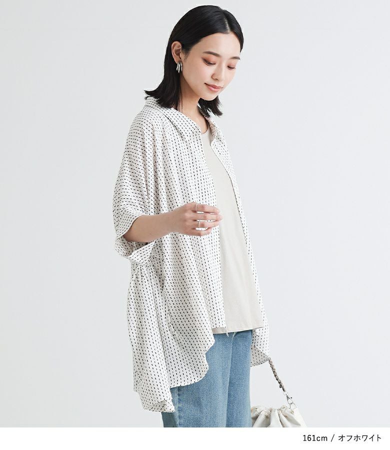 小さい幾何学柄がプリントされたシャツ。袖にたっぷりギャザーを入れ、脇下のドレープになった変形シルエットがポイントになります。丈に前後差をつけたデザインで抜け感を演出し、ヒップもしっかりカバーします。