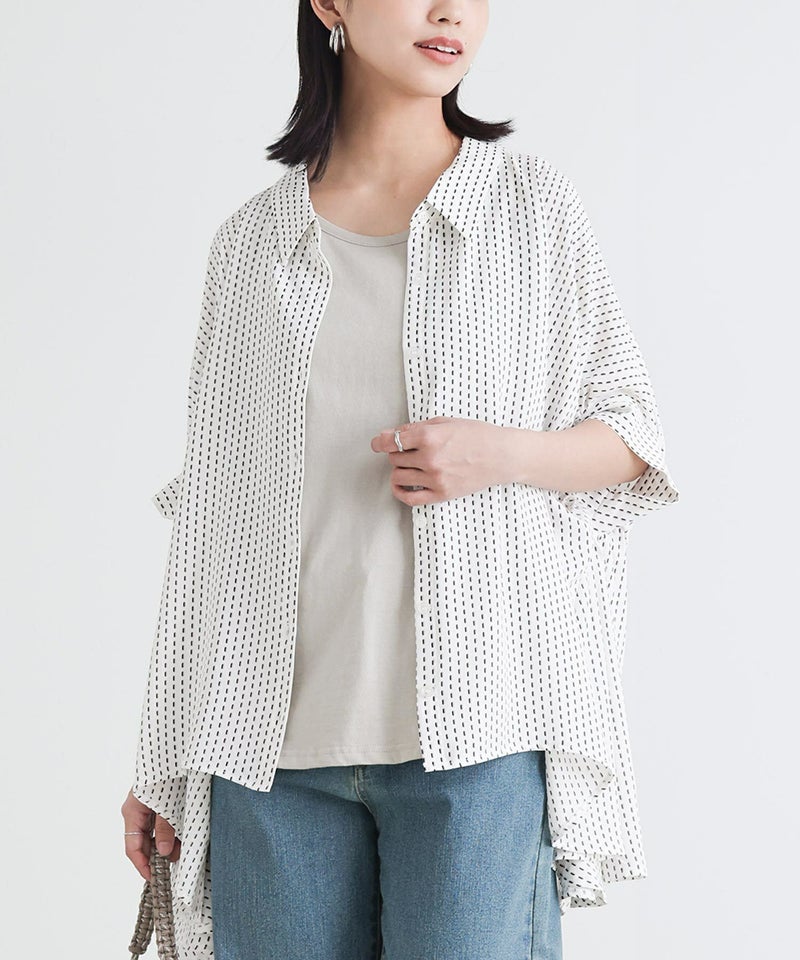 無地のシンプルなボトムスと合わせるだけで、柄とシルエットが映えてお洒落見えします。ボタンを開けて羽織っぽく着るのもおすすめ。