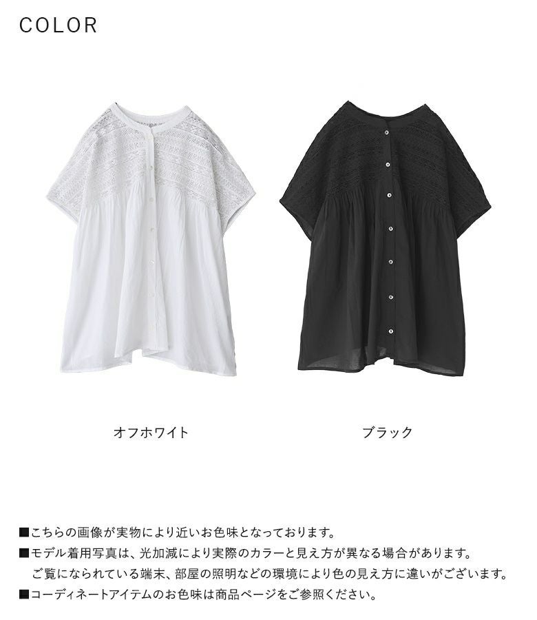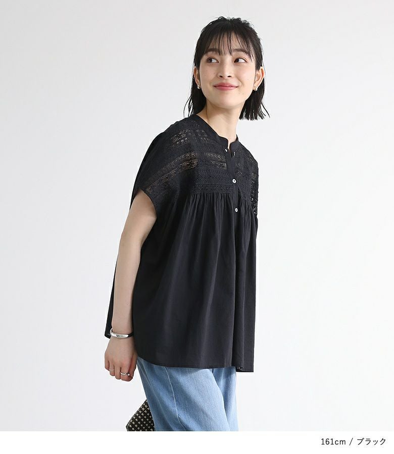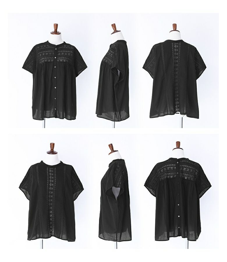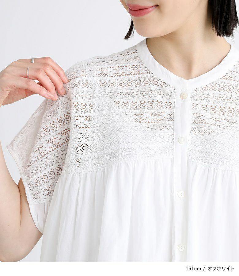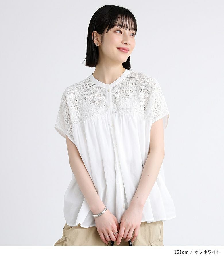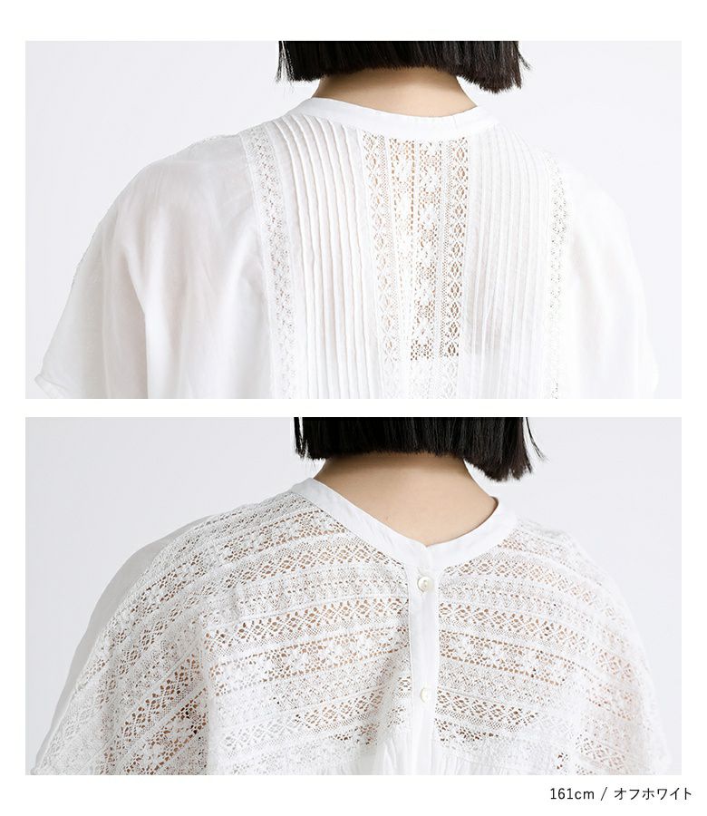 繊細で複雑なモチーフが印象的なリバーレースをあしらったブラウス。前後2WAYで着用できます。身体のラインを拾わないゆるっとしたサイズ感に、貝ボタンがアクセントになったデザインです。