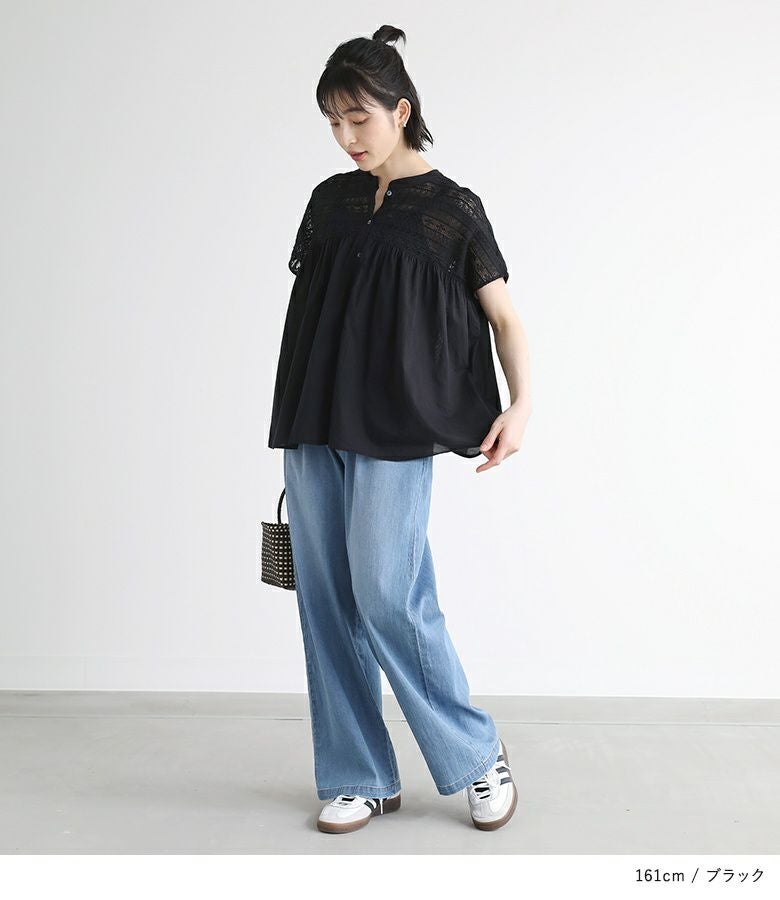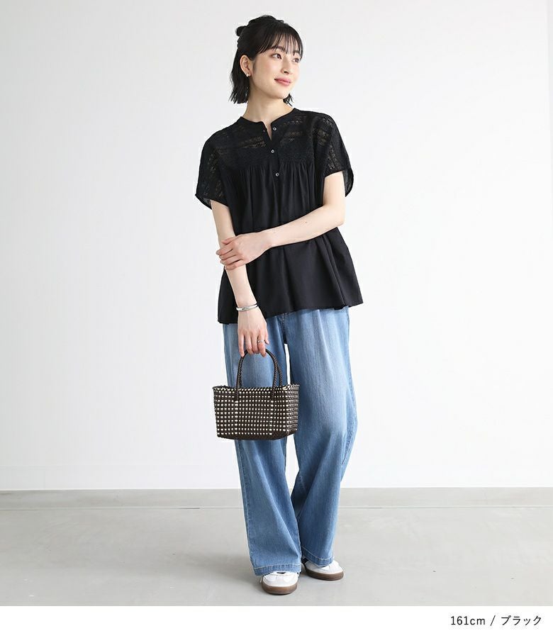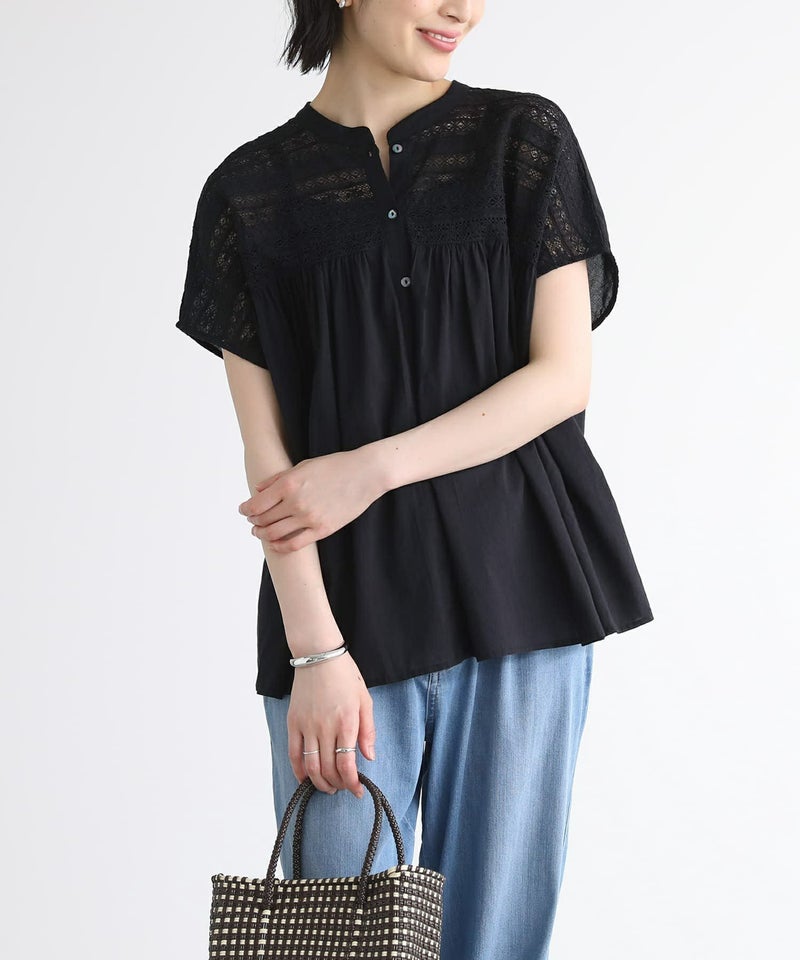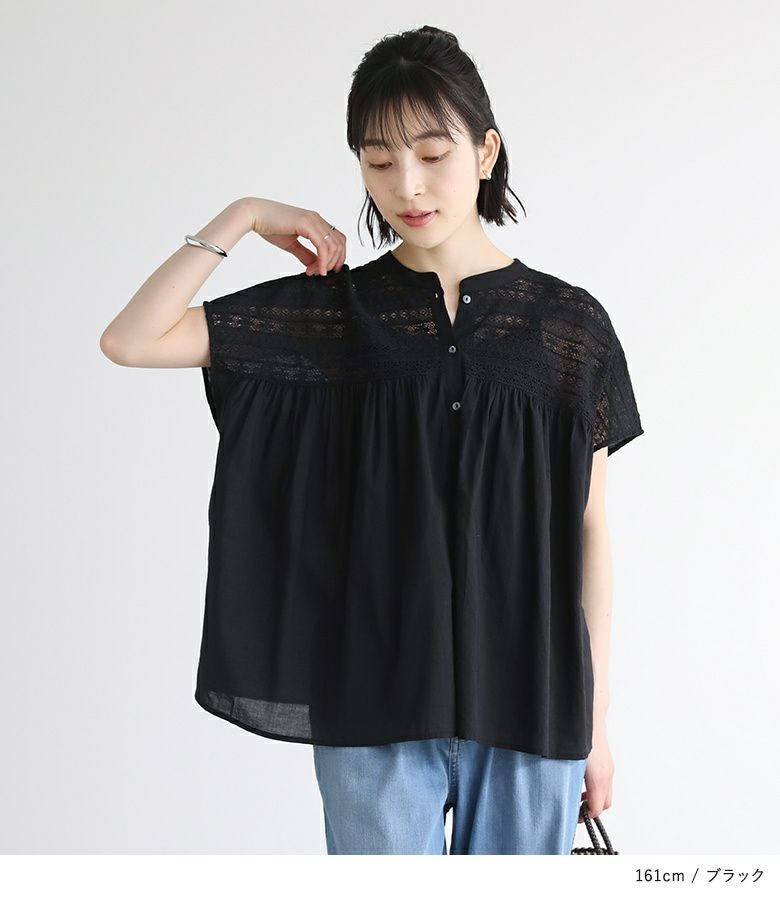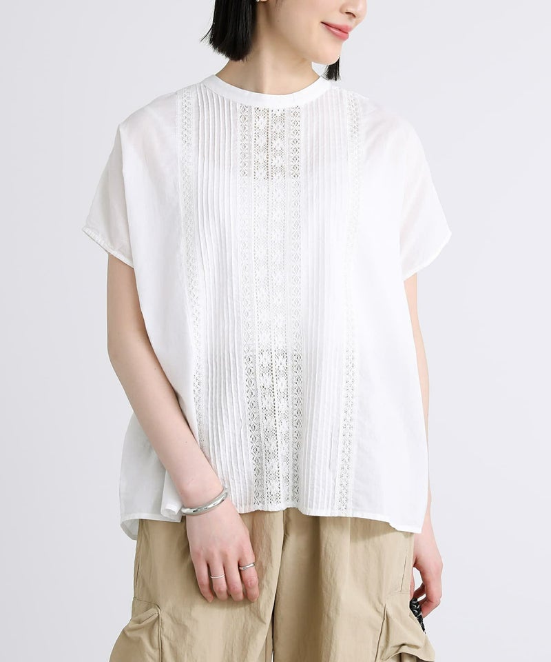 繊細で複雑なモチーフが印象的なリバーレースをあしらったブラウス。前後2WAYで着用できます。身体のラインを拾わないゆるっとしたサイズ感に、貝ボタンがアクセントになったデザインです。