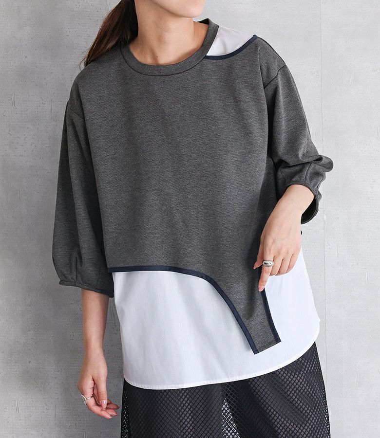 一枚でお洒落が完成する異素材レイヤードトップス。シャツを重ねたようなドッキングデザインで、他にはない個性を惹き立てる一着です。肩部分の丸いカッティングから見える、配色の布帛生地がポイント。裾のパイピングや、パイピングと同じラインに入れたデザインステッチが、細部にまでこだわりの詰まった仕上がりです。