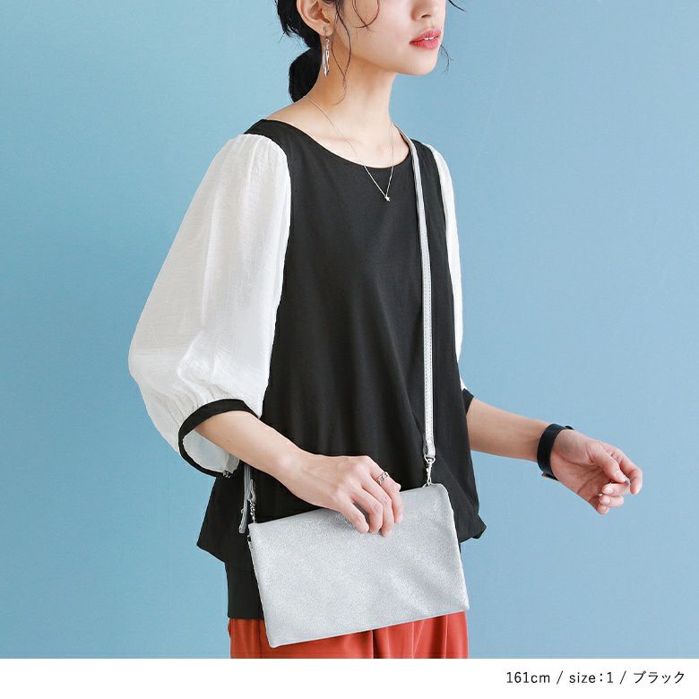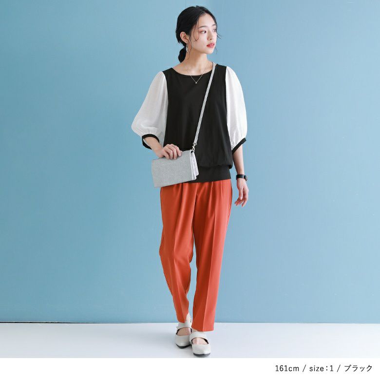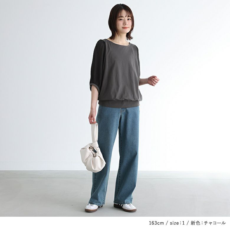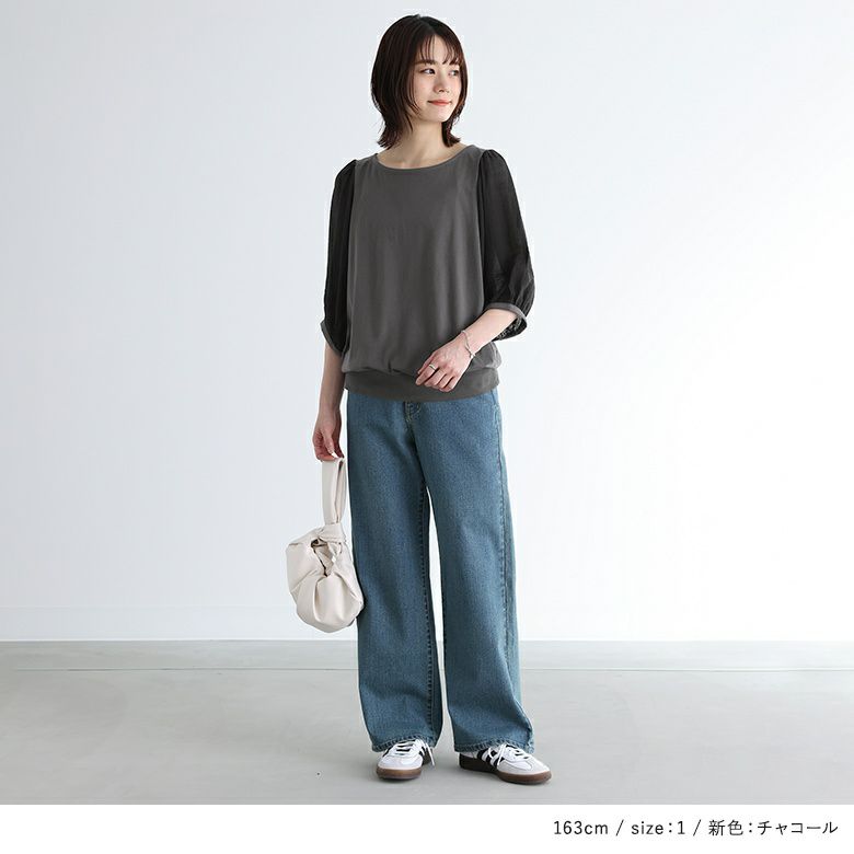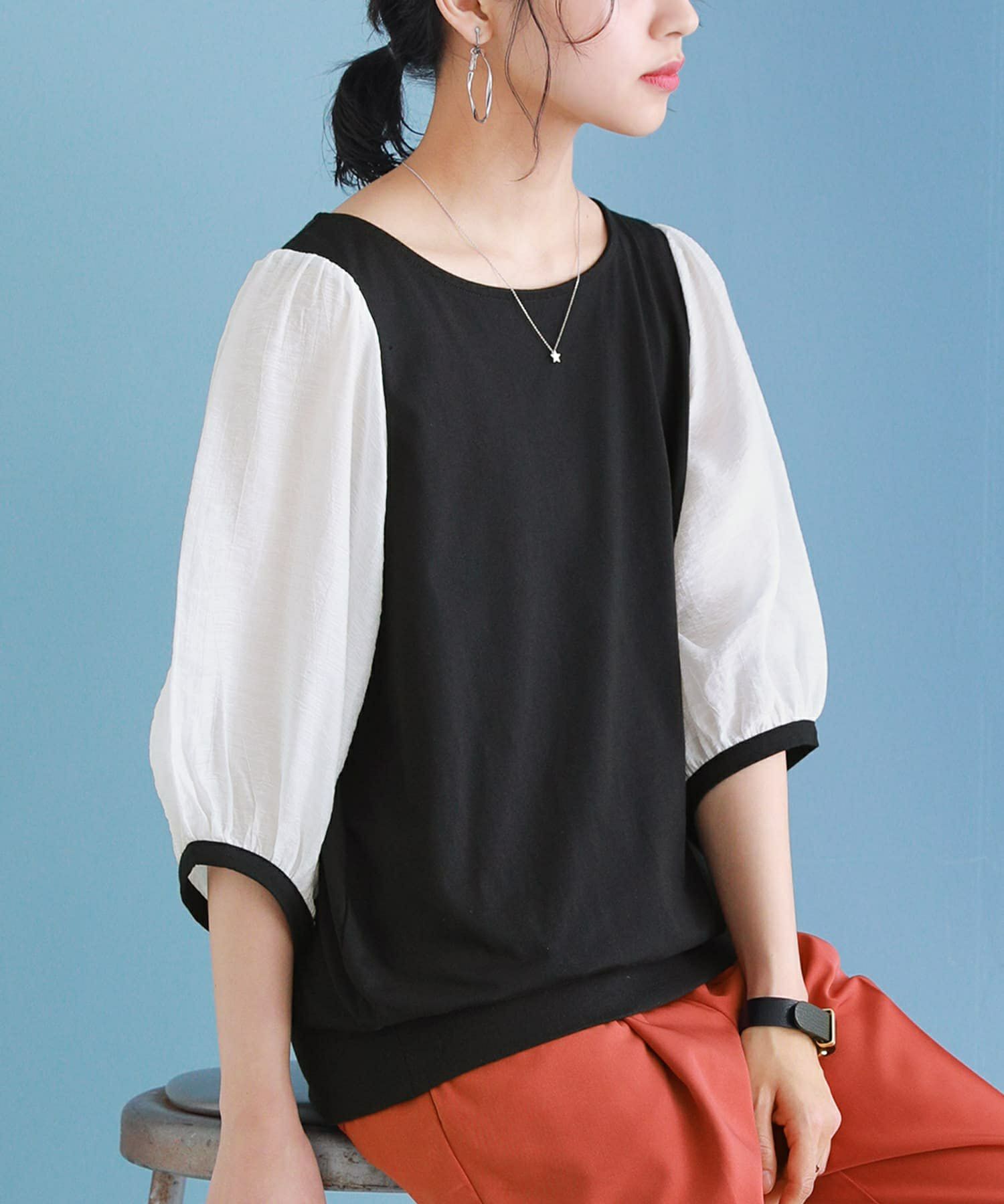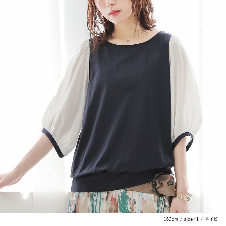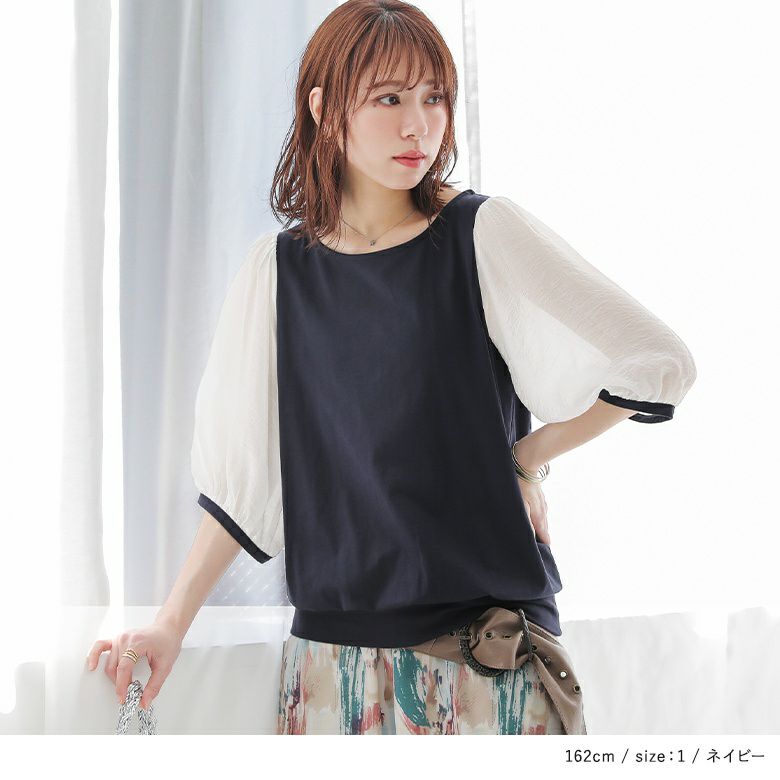 透け感が涼しげなぽわん袖が目を惹く、シアー袖×カットソーの異素材デザイン。気になるところはしっかり隠す6分袖も嬉しいポイントです。