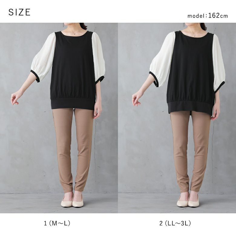 1(M~L)は、全体的にジャストなサイズ感であまり余裕はありませんでした。裾リブはやや締め付け感がありました。2(LL~3L)は、程よいゆとりのあるサイズ感で着られました。裾リブはヒップにかかる位で留めて着るのが綺麗でした♪私の場合は、2(LL~3L)を選びます。