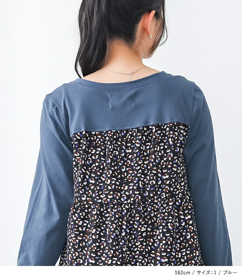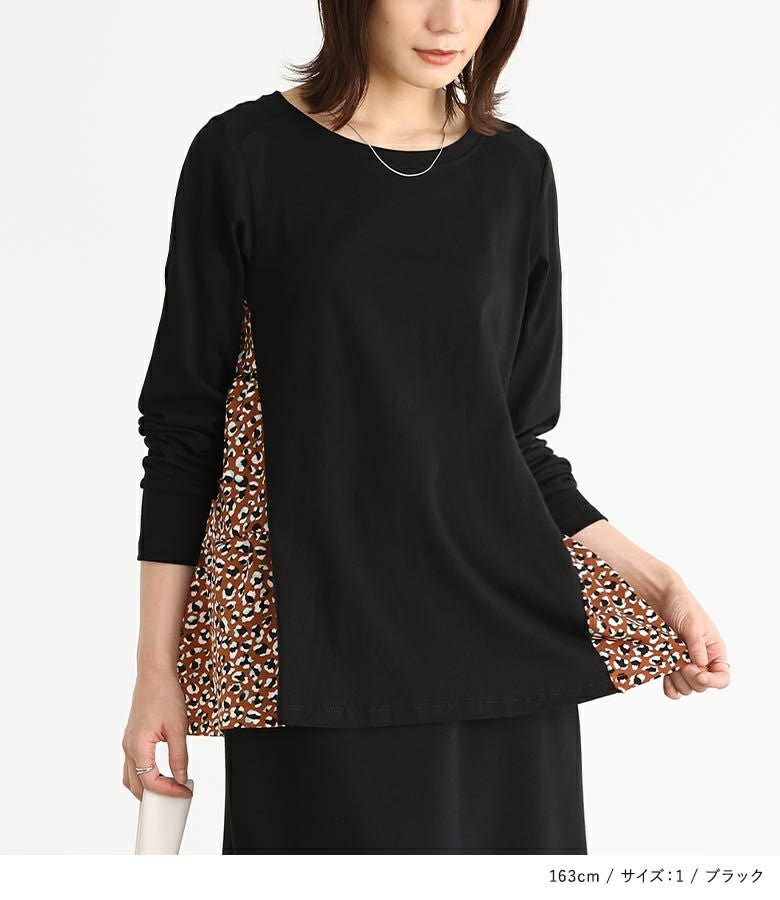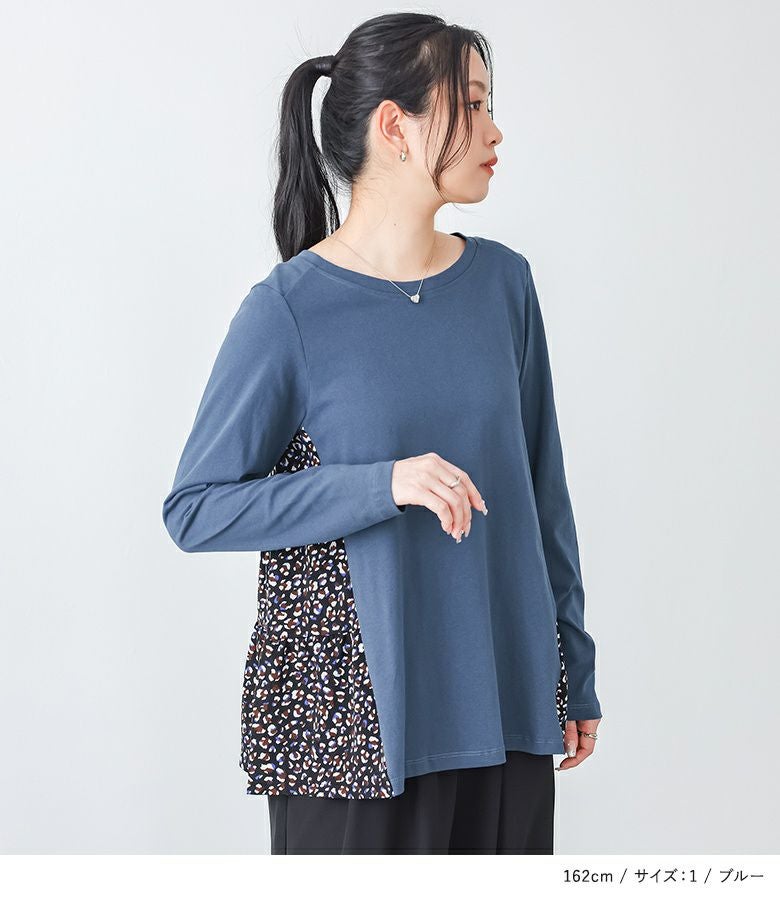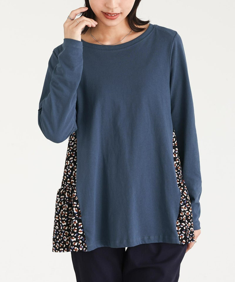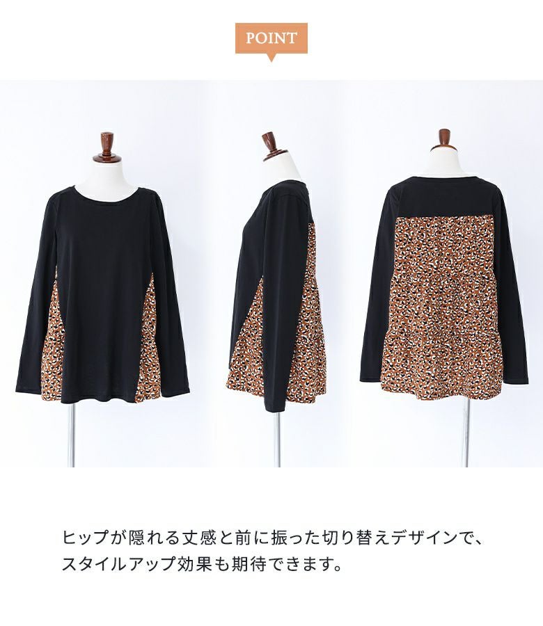 カットソー×プリント柄生地を組み合わせた、異素材使いがお洒落なデザイントップス。ヒップが隠れる着丈と前に振った切り替えデザインで、スタイルアップ効果も期待できます。