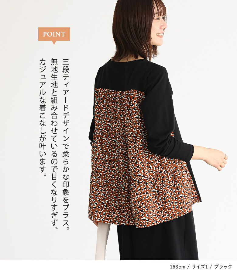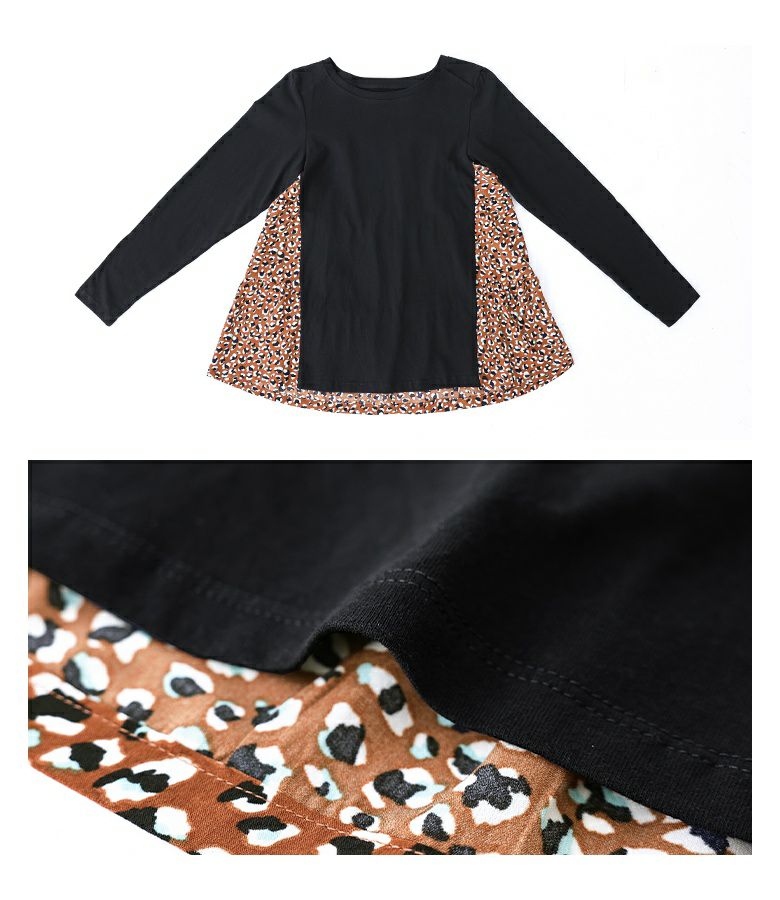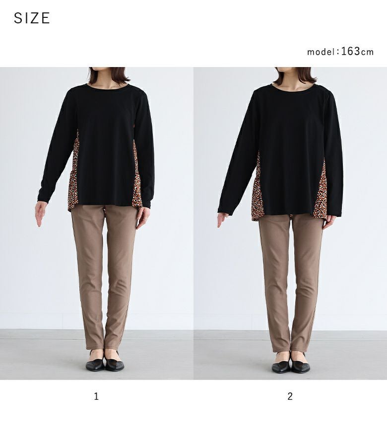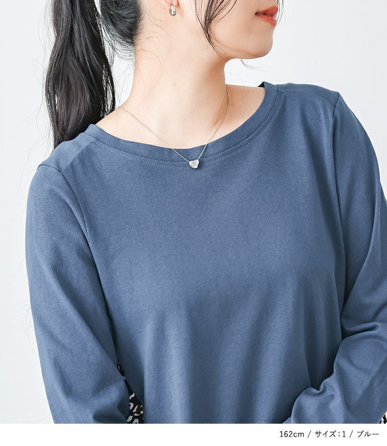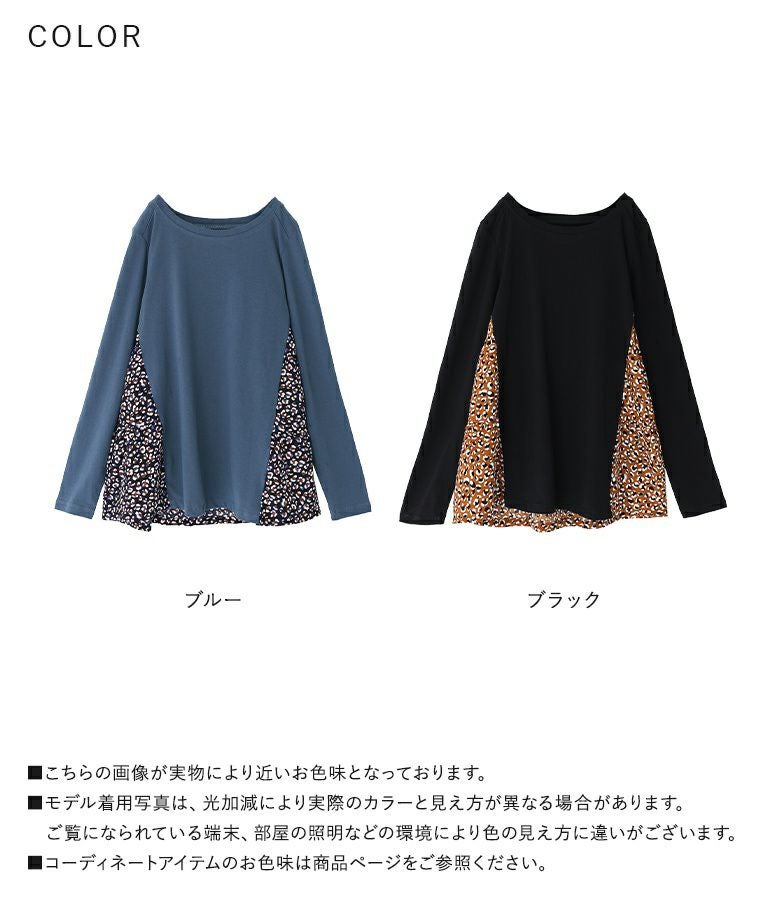 カットソー×プリント柄生地を組み合わせた、異素材使いがお洒落なデザイントップス。ヒップが隠れる着丈と前に振った切り替えデザインで、スタイルアップ効果も期待できます。