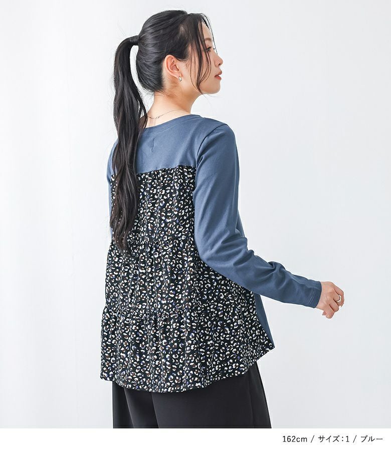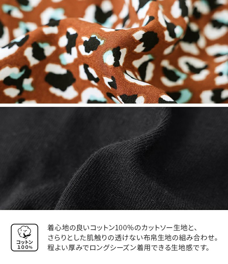 カットソー×プリント柄生地を組み合わせた、異素材使いがお洒落なデザイントップス。