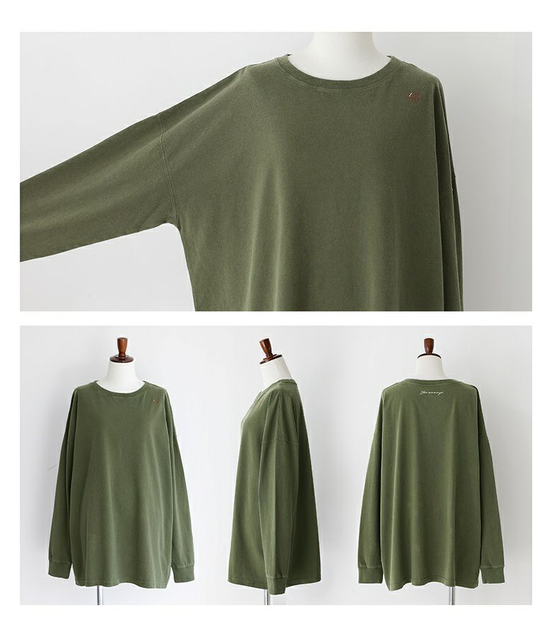 ヒップラインをカバーする丈感と、程よくゆったりしたシルエットがリラックス感のあるロンT。左肩に施された小さなお花のワンポイント配色刺繍がさりげないアクセントです。背中の英字刺繍は、控えめながらも温かみのある「あなたのままでいい」というメッセージが込められています。