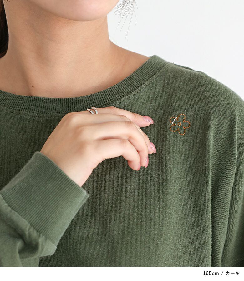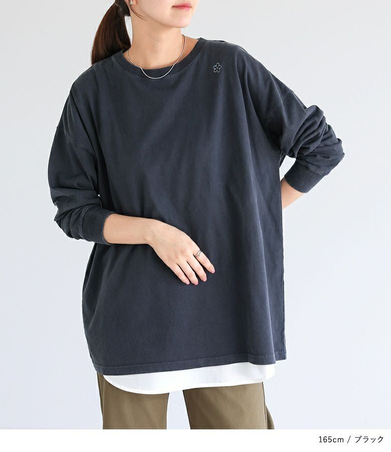 左肩に施された小さなお花のワンポイント配色刺繍がさりげないアクセントのロンT。